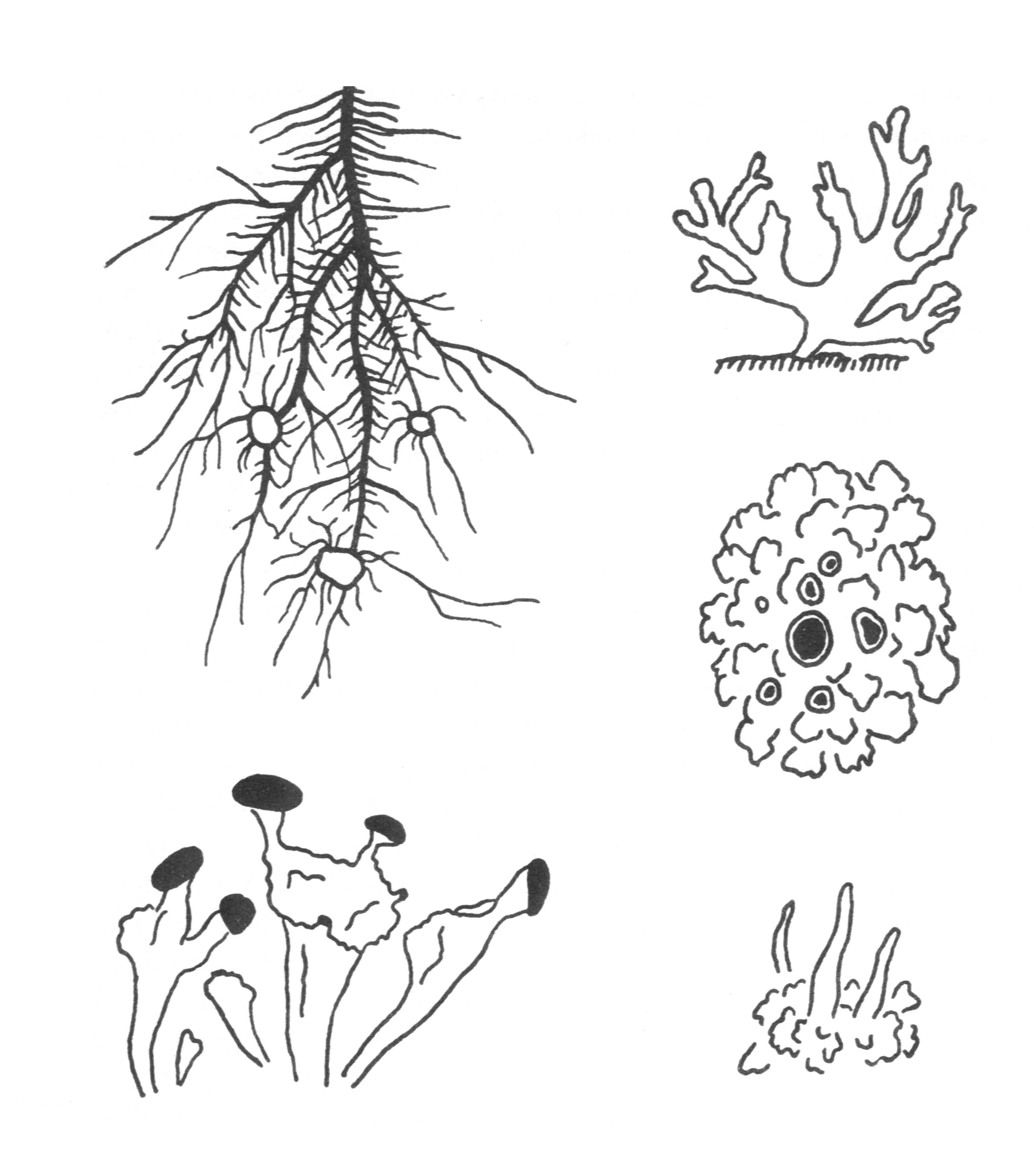 Verschillende korstmossen. Lboven. het baardmos, zoals het aan de bomen van onze bergwouden hangt. Daarnaast: geweimos. Daaronder een schubbenmossoort met stuifmeelschoteltjes. Onder: een zeer sterk vergrote bekermos. Daarnaast een cladoniasoort