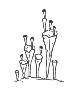 En wat schenkt de aarde aan de korstmossen? Op deze vraag een antwoord te vinden is moeilijker, maar de natuuronderzoekers hebben wel wat gevonden, waarover zij zelf ook steeds verbaasd staan: in het korstmos zit namelijk, op de een of andere geheimzinnige manier een paddenstoel verborgen! Deze paddenstoel kan natuurlijk niet zo groeien als gewoonlijk. Alleen al omdat hij geen mogelijkheid heeft zijn dradennetwerk in stenen of boomschors te stoppen en omdat hij aan de oppervlakte moet blijven, moet hij anders worden. Hij kan maar heel langzaam groeien en moet heel klein blijven. Toch komt hij soms heel duidelijk tevoorschijn. Je vindt dan in het bos van tijd tot tijd die verzameling van trechtervormige korstmossen. Soms staan er zelfs twee of drie trechtertjes bovenop elkaar. Daar heb je nu de trechtervorm van de paddenstoel. Tja, je kunt de korstmossen die in allerlei soorten afwisselend voorkomen nog het beste begrijpen, wanneer je bedenkt hoe hier de paddenstoelenvorm en de echte plantenvorm in het klein met elkaar spelen. Dan eens voert de ene de boventoon, dan ontstaan nietige trechtertjes, buisjes, schoteltjes enz. en dan weer ontstaan korsten, blaadjes, lapjes, stengeltjes, draden enz. maar de twijgjes en korstblaadjes van de korstmossen missen wel die wonderlijke regelmaat en orde, die we in de bouw van de hogere planten zo kunnen bewonderen. Iedere keer wanneer een korstmos een hogere plant zou willen worden, komt gauw de paddenstoel en veroorzaakt weer wanorde. Daarom blijft in de vorm van de korstmossen alles vaag. Van de paddenstoelen komen ook de fijne zuigdraadjes, met wier hulp de korstmossen zich op hun ondergrond vasthouden, zodat je ze niet loskrijgt, zonder ze te scheuren. Ze kunnen er zich gemakkelijk vanaf maken. Ze kunnen namelijk eenvoudig afbrokkelen of ze stoten van hun oppervlakte een grijsgroene stof af. Dan komen wind en regen en verspreiden de delen overal heen en waar er een terecht komt, gaat een nieuwe korstmos groeien, maar de korstmossen kunnen nog iets meer en dat hebben ze van de paddenstoelen geleerd. Ze kunnen ook echte sporen ontwikkelen. Af en toe vind je in het bos korstmossen of bekerkorstmossen, waarop heel echte, nietig kleine paddenstoeltjes zitten die met prachtige kleuren glanzen, meestal rood- of geelachtig. Wie zou er nu nog aan willen twijfelen dat in de korstmossen werkelijk een betoverde paddenstoel verstopt zit. Wanneer de korstmos het vruchtlichaam vormt, laat hij de paddenstoel op zichzelf staan en meteen valt de prachtige verkleuring op en wordt tot verklikker. Iets anders doen een paar korstmossen dit die op boomschors groeien. Ze laten, wanneer ze de vruchtlichamen willen vormen, i.p.v. paddenstoelen, kleine schoteltjes ontstaan.