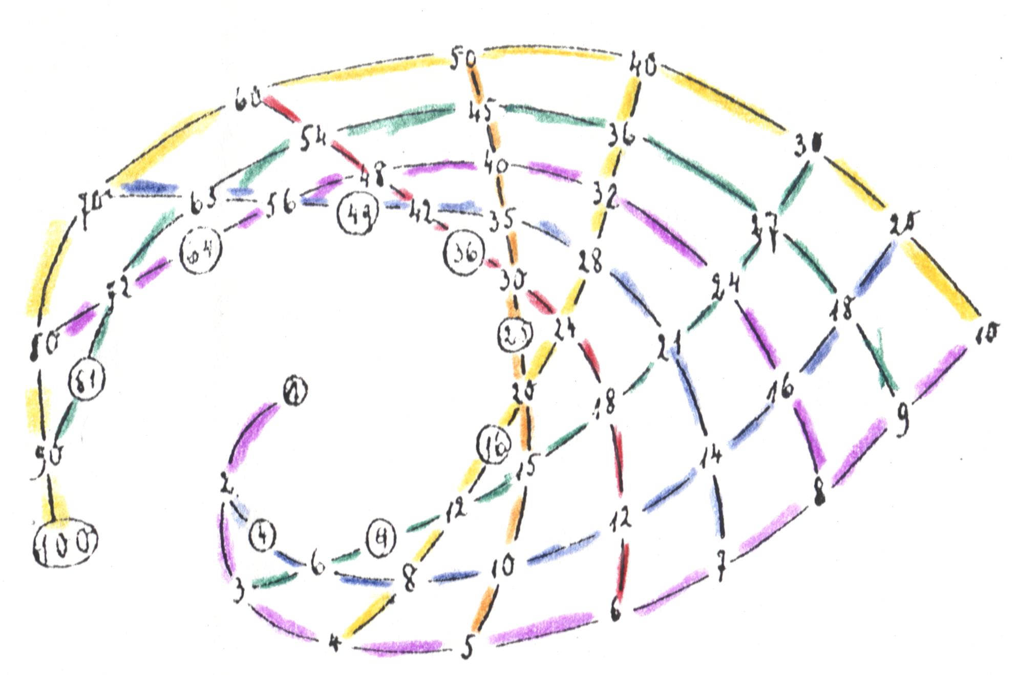 Alle getallen in deze voorstelling, behalve die waaromheen een cirkeltje staat, zijn kruispunten van 2 lijnen, bevatten dus 2 basisgetallen tussen 1 en 10 als hun product. Zitten er nog andere basisgetallen in, dan zul je die op een andere plaats terugvinden.