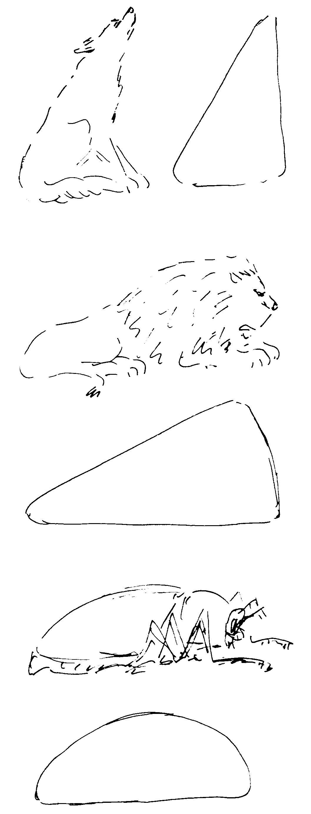 De driehoek onder de leeuw is een uitstekend uitgangspunt. De driehoek steeds verder tot ‘leeuwbeweging’ maken en omvormen tot in meer details – alles wat schetsmatig; meer een ‘aangeven’ waar de details ongeveer zitten – dan blijft het levendig en kunnen de kinderen verder komen in de richting van een ‘echte’ leeuwentekening.