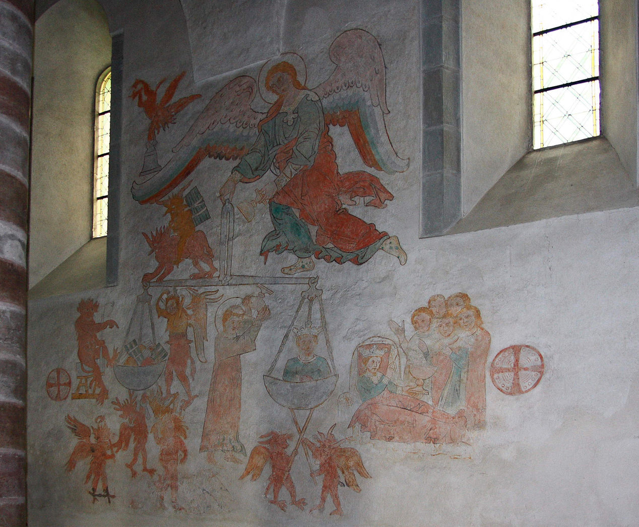 Nu bestaat er in Noord-Europa een andere afbeelding van dit gebeuren, die ons kan helpen een antwoord te vinden. In het zuiden van het eiland Gotland voor de Zweedse kust staat een kerk in de plaats Vamlingbo. Op de noordelijke wand van deze kerk is een groot fresco geschilderd, dat een verrassend levendig beeld geeft van Michaël als zielenweger. We zien de Duitse keizer Hendrik II op zijn sterfbed. Tijdens zijn leven heeft deze keizer veel gedaan voor de innerlijke versterking van de kerk. Als symbool van dit streven schenkt hij de vijf priesters aan zijn sponde een gouden kelk.