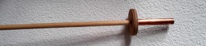 Neem een rondhout van ongeveer 1 m of iets korter. (doorsnede 12 mm. Zaag met de gatenzaag een rondje van ongeveer 6 cm uit wat dikker triplex. Rasp het middengat iets uit, zodat het rondhout er nauwsluitend inpast, lijm het extra vast op 2 cm van de bovenkant van het rondhout. Maak een koperen buisje (12 mm) en bevestig dit over deze 2 cm heen (lijm) zodat het op het ronde stukje triplex rust. Het kan een cm. of 6 à 7 lang zijn. Neem een kaarsje dat er goed stevig in bevestigd kan worden – meestal door het iets te slijpen. Wind om het stokje een blauw lint, een beetje diagonaal van boven naar onder en bevestig bovenaan, niet zo hoog als het kaarsje, een takje dennengroen.