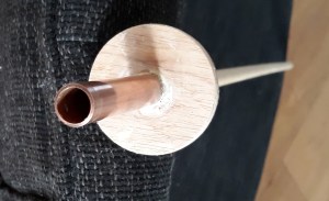 *om brandgevaar te verminderen – het staat ook mooi! in het gat een stukje koperbuis dat iets boven het blokje uitsteekt. (phaw)