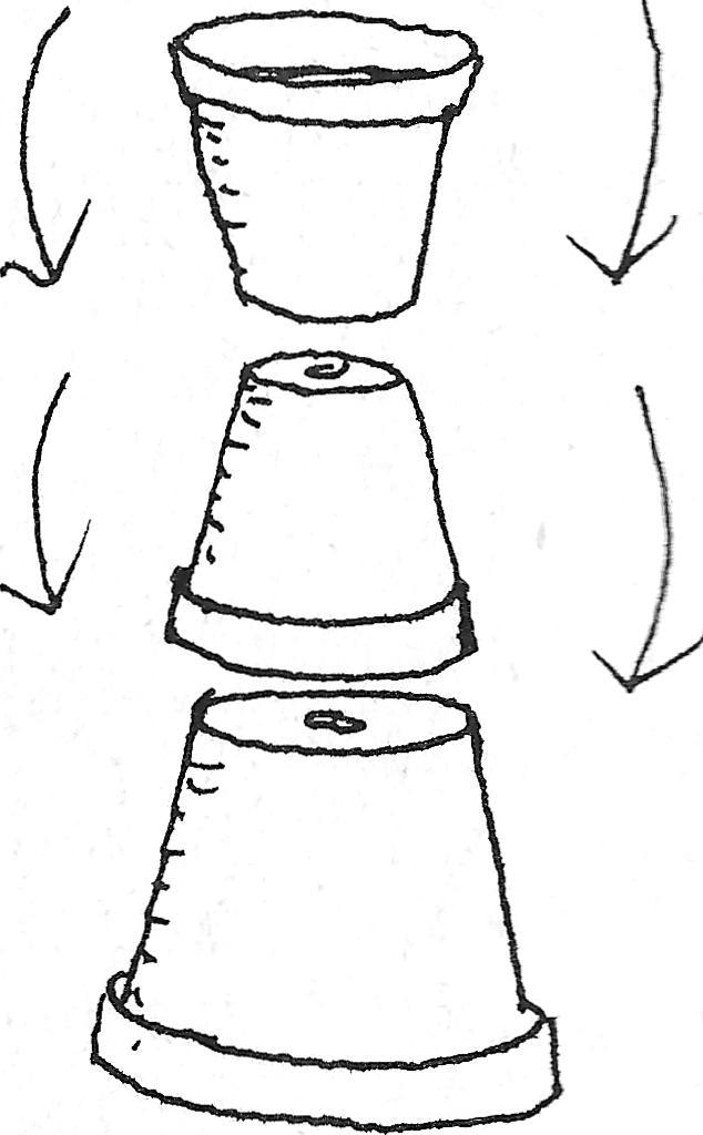 Per figuur heb je twee bloempotjes nodig met aan de open zijde een diameter van zeven centimeter en één grotere met een diameter van negen centimeter. Verder een pakje ‘Dasklei’, een soort kant en klaar papiermachéprodukt (verkrijgbaar bij hobby-, boek- of speelgoedwinkels) en plakkaatverf.