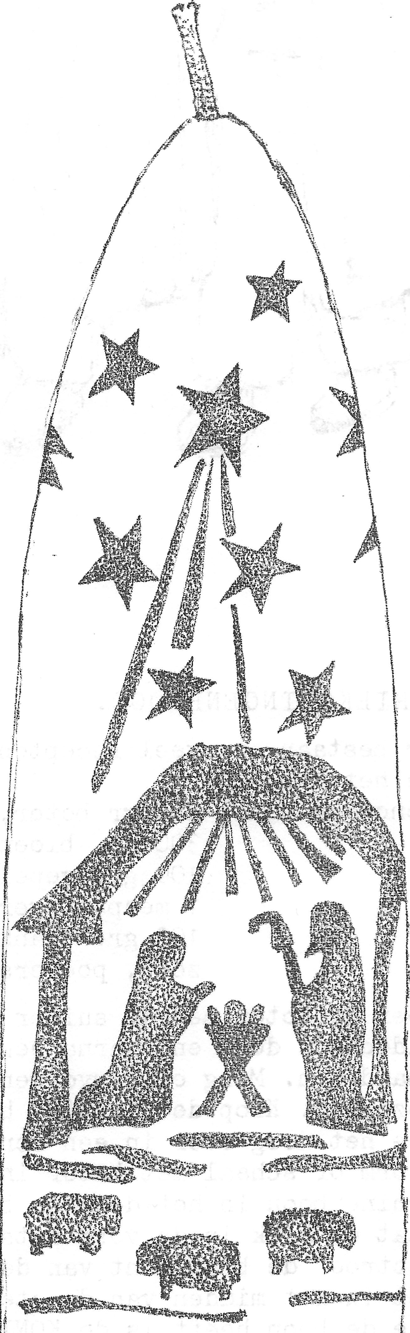 Zaag het stukje hout intussen tot een cirkel met een straal van circa 8 cm. Sla een dunne spijker in het midden en trek hem er weer uit. Kort de breinaald in tot 26 cm en zet hem klem in het gaatje in het hout. Als de blauwe strook goed droog is vouwen we hem rond en plakken hem vast op de plakstrook. Als we zorgvuldig hebben gewerkt past het gouden molendak precies in de blauwe wand. Zelf heb ik door nonchalant te werken de omtrek van het dak met één millimeter verbreed door de plakrand niet goed om te vouwen. Het resultaat was dat de molenwand vijf millimeter te krap was. Lijm wand en dak zorgvuldig op elkaar. Ter versteviging wordt er onderaan de wand, aan de binnenkant, nog een strook papier geplakt zodat die mooi rond loopt. Wanneer er nog deuken in de wand zitten dan kunnen die ook weggewerkt worden door er stevig papier van achter tegenaan te plakken. Zet de molen nu op de naald. Waarschijnlijk moet ze nog in evenwicht worden gebracht, wat weer met stukjes papier kan worden gedaan. Als alles recht hangt is het moment van inwijding daar. Dat gaat als volgt: maak de kamer donker en plaats het werkstuk op tafel. Zet een paar waxinelichtjes onder de kap, vlak tegen de naald en steek ze aan. Op het plafond van de kamer verschijnt een stralende, draaiende ster en op de molen zien we de drie koningen – de rode, de groene en de blauwe – geduldig voortreizend, als maar rond, op weg naar het Kind.