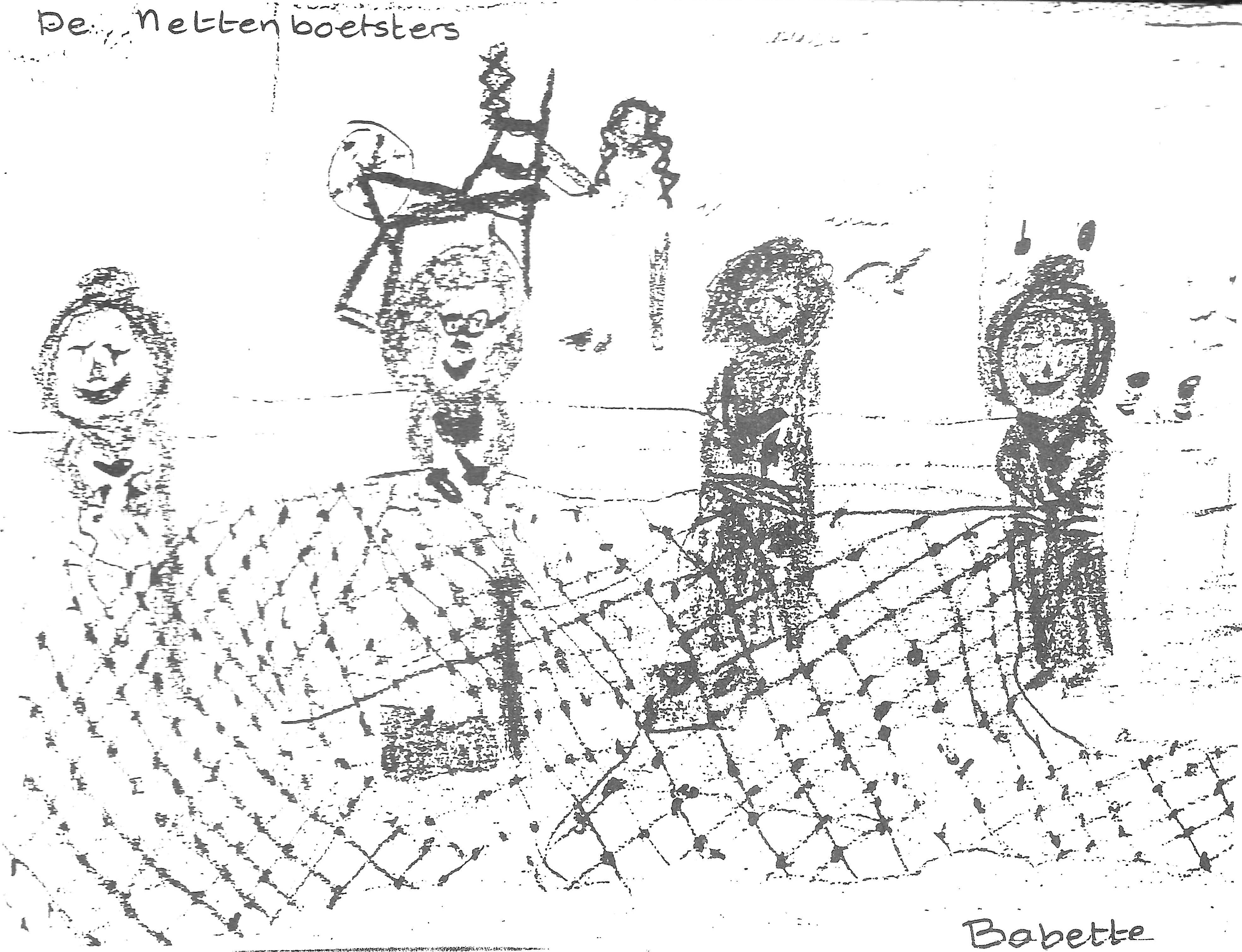 Een waar feest was het bezoek van de nettenboetsters uit Katwijk. Vier dames op klompen, wat witte schorten aan en rooie zakdoeken om, stapten de klas binnen. Ze haalden een groot net te voorschijn, sneden er grote gaten in en gingen aan het werk. Hun handen gingen net zo snel als hun mond en de kinderen keken hun ogen uit. Ze vertelden over het werk vroeger. Hoe koud het was op de boetzolder ’s winters en dat ze niet mochten praten met elkaar, alleen mocht bij uitzondering een lied uit de bundel van Johannes de Heer gezongen worden. ’s Middags kregen ze één kopje thee, maar dat er dan eerst iemand een emmer heet water moest gaan kopen voor 3 cent in de water-en-vuurwinkel. U begrijpt, dat dit wonderlijke verhalen zijn voor de kinderen van nu die alle luxe van elektriciteit en een warmwaterkraan van jongsaf kennen.