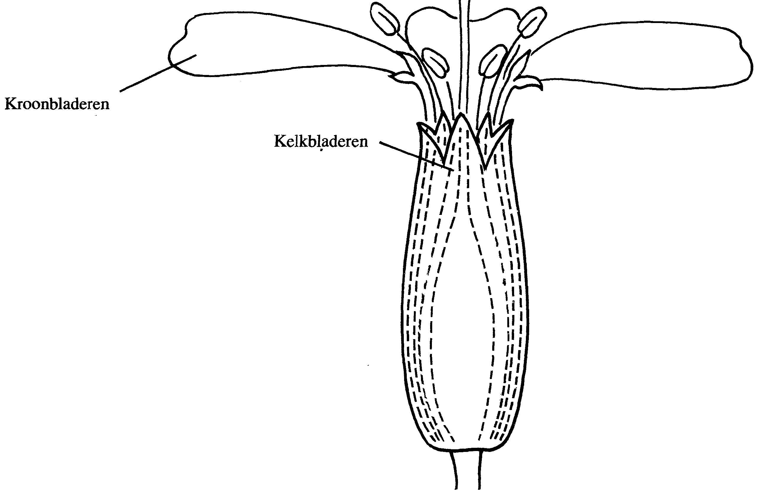 Men onderscheidt de kelkbladeren, de kroonbladeren, de meeldraden en de stamper.