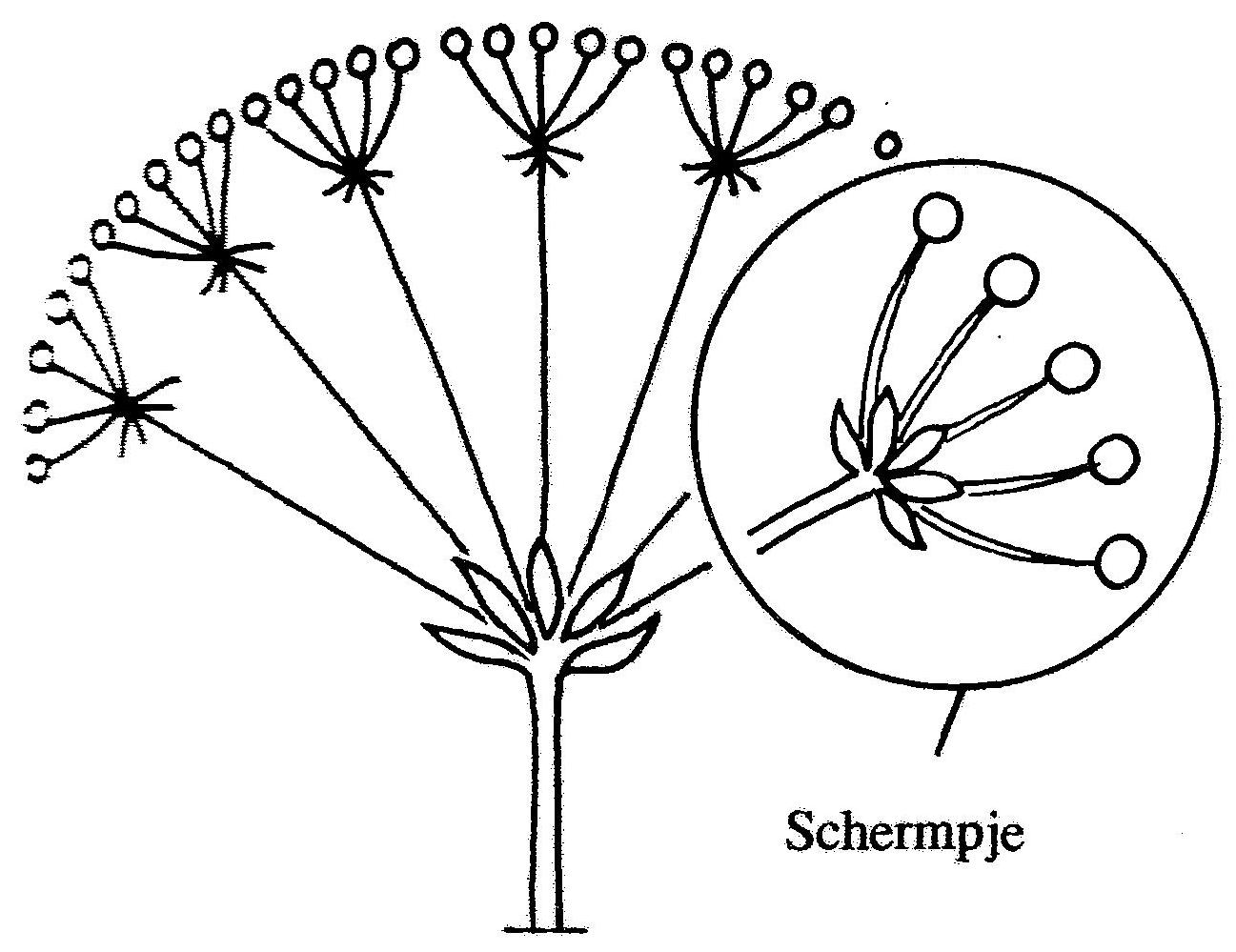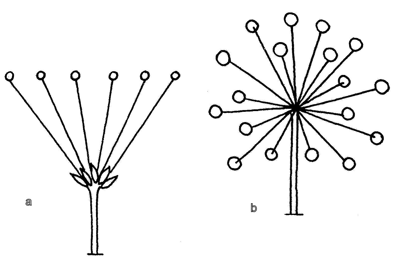 Schematische tekening van een schermvormige tros: (a) peer; bij het gewoon duizendblad (b) is hij samengesteld.