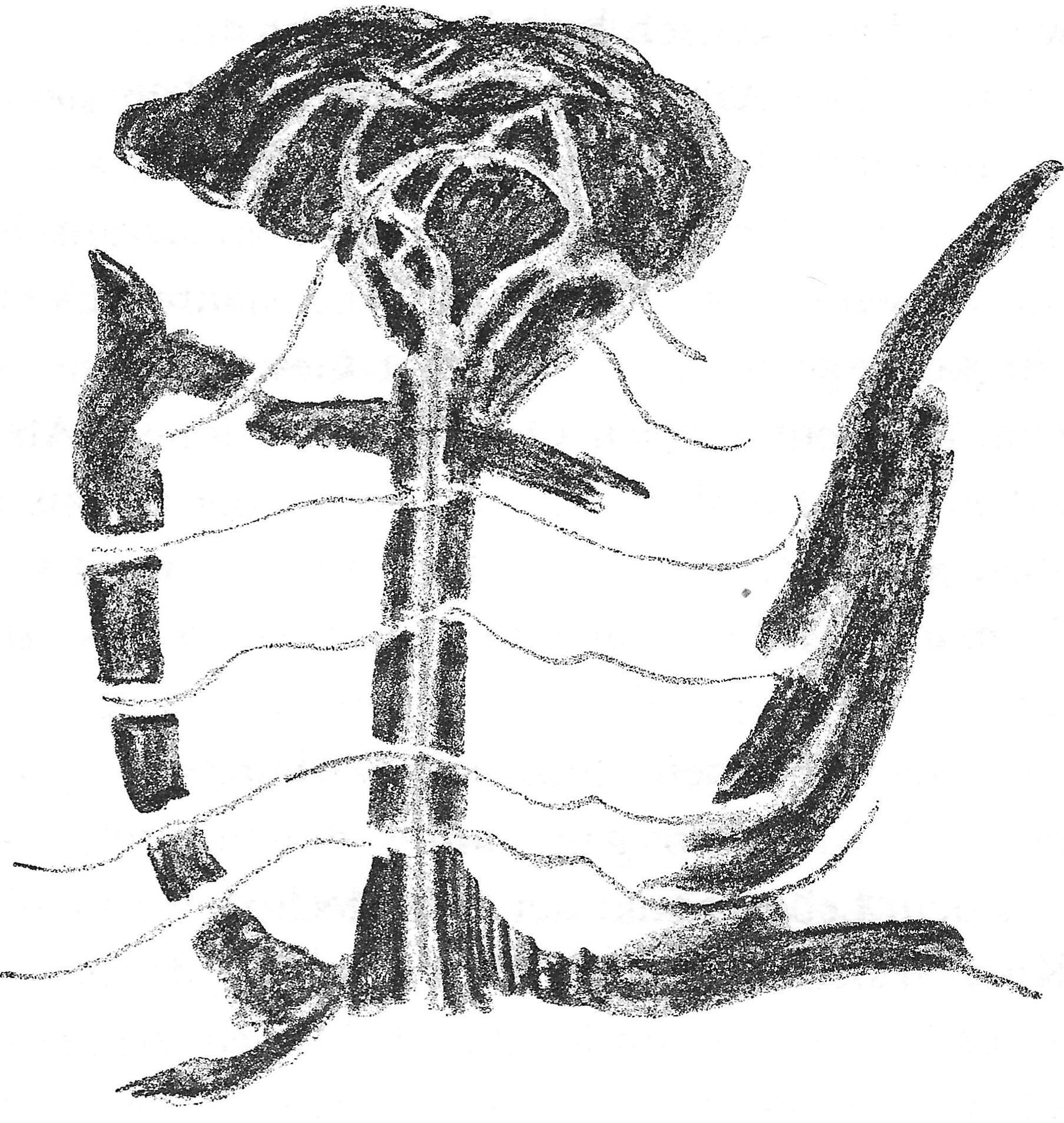 Was nun besonders in Betracht kommt, das ist die Art, wie die Atmung mit dem ganzen Nervensystem zusammenwirkt. In der Tat, dieses Zusammenwirken der Atmung mit dem ganzen Nervensystem ist etwas ganz Besonderes im menschlichen Organismus. Dafür sollte man als Lehrer, als Erzieher das allerfeinste Gefühl haben. Nur dann, wenn man dieses feine Gefühl hat, wird man richtig unterrichten können. Es geht da also die Atemluft in den Körper hinein, breitet sich aus, geht durch den Rückenmarkskanal da hinauf (siehe Zeichnung), breitet sich im Gehirn aus, kommt immer zusammen mit den Nervensträngen, geht wieder herunter und verfolgt die Wege, wodurch sie dann als Kohlensäure ausgestoßen werden kann, So daß wir fortwährend das Nervensystem von der eingeatmeten Luft bearbeitet haben, die sich ausbreitet, durch den Rückenmarkskanal hinaufgeht, sich ausbreitet, mit Kohlenstoff sich durchdringt, wiederum zurückgeht und ausgeatmet wird. Dieses ganze Atmen, wie es längs der Nervenstränge geht, wird erst im Laufe. der Zeit. in der