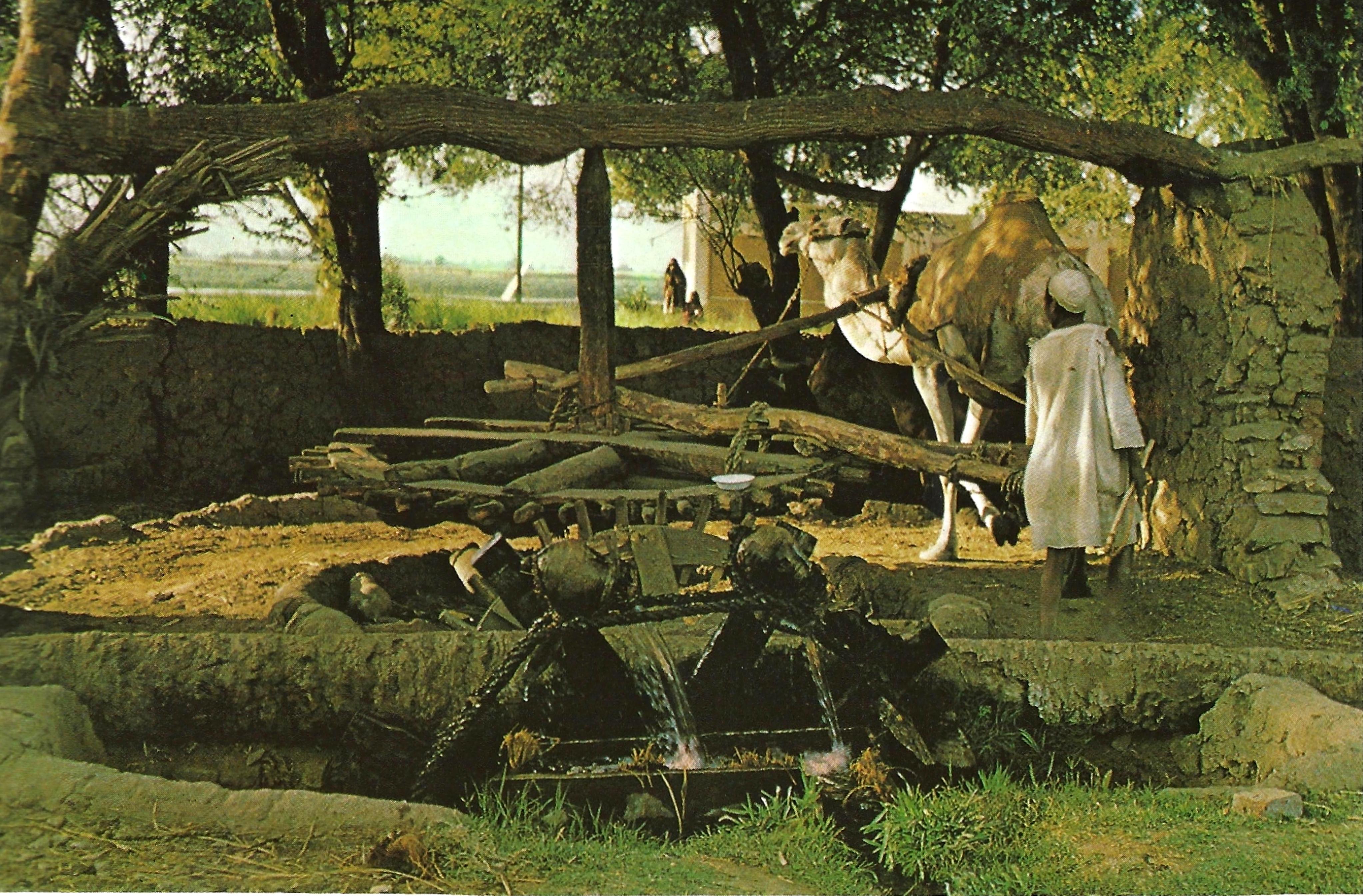 Het wiel wordt aangedreven door een houten, horizontaal geplaatst tandrad dat door een geblinddoekte os draaiende wordt gehouden. Een kind in een lang, smoezelig hemd zit op de dissel en drijft het dier voort met een doornige tak. Daarbij zingt het met schelle stem een Arabisch wijsje om de os aan te vuren en zichzelf over zijn verveling heen te helpen. Een bizarre, magere vogel begeleidt zijn gezang, een soort leeuwerik die je ook met starre ogen blijft aankijken wanneer hij je van voren aankijkt – op een manier zoals men het alleen nog op de fresco’s in het Dal der Koningen kan zien.