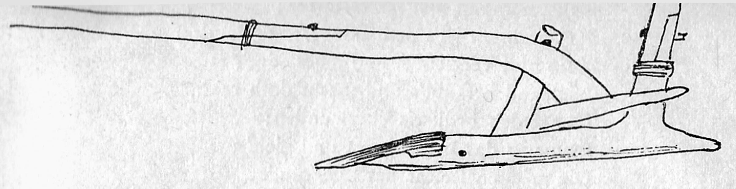Hier zie je het gespan, de horizontale ploegboom en de sterk gebogen achterboom die tegelijkertijd de ploegkop en de staart voorstelt met de loodrechte verkruimelaar. Zulke ploegen bestaan nog steeds.