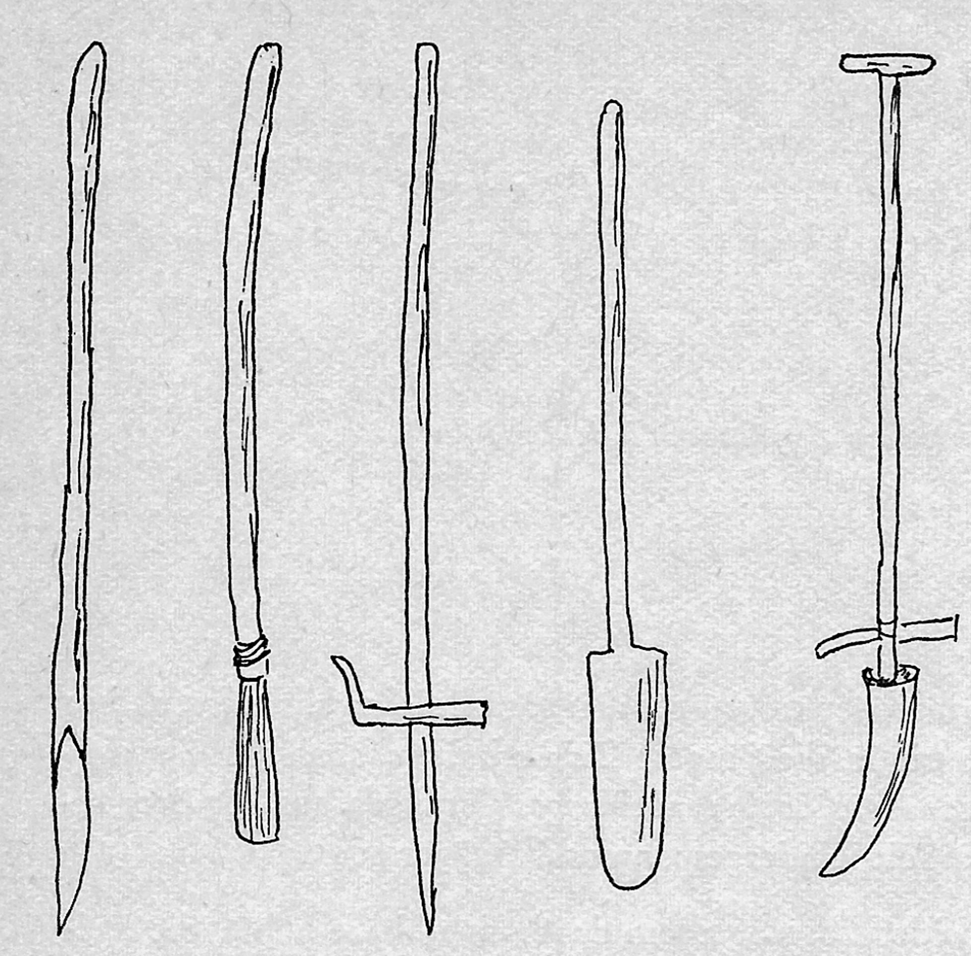 ploeg 7Graafstokvormen uit Zuidoost-Azië. Rechts een graafstok met koehoorn als punt – eiland Sylt.