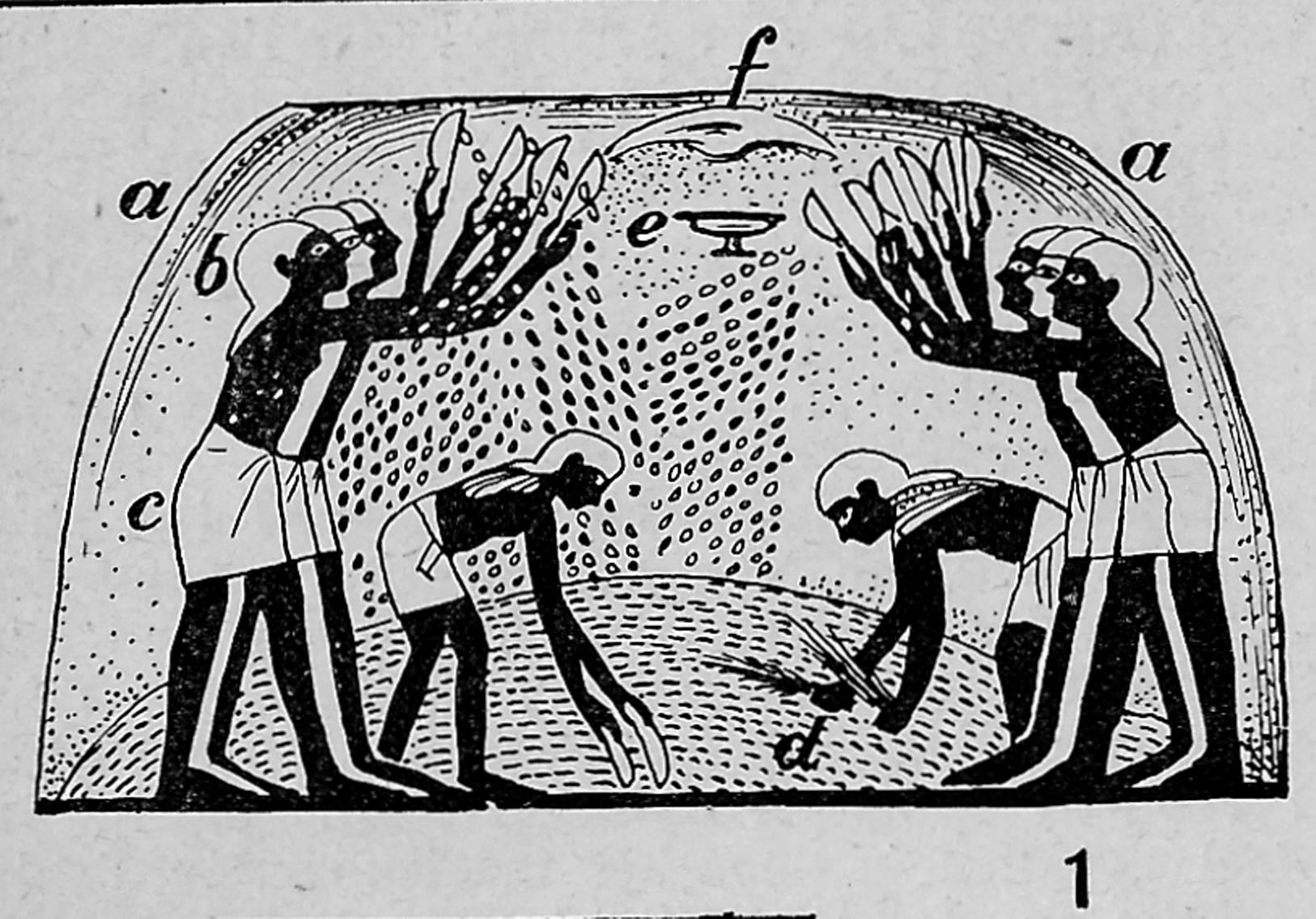 De zware korrels vallen loodrecht neer; het kaf (a) met een boog rechts en links in de lucht. De wannende vrouwen dragen een hoofddoek (b) en een lendenschort (c). Zij hebben een wannersschop in de hand, waarmee zij het koren opwerpen. Een vrouw veegt de korrels samen met gebundelde takken (d). Bovenaan een oogstoffer: een schaal water (e) en daarboven is een stellage waaraan gebonden zijn de eerstelingsgarven (ƒ) van de oogst.