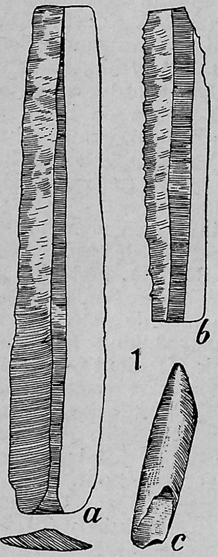 (a, b en c) uit de heuvel el ‘Oreme (aan het Meer Gennesareth). Aan de metaaltijd gaat de steentijd vooraf; deze vuursteenmessen zijn uit de jongere steentijd of neolithicum. Zulke vuursteenmessen gebruikte Jozua toen hij stenen messen nam voor de besnijdenis (Jozua 5:3). Ook Zippora nam een stenen mes voor de besnijdenis van haar zoon (Ex. 4 : 25).