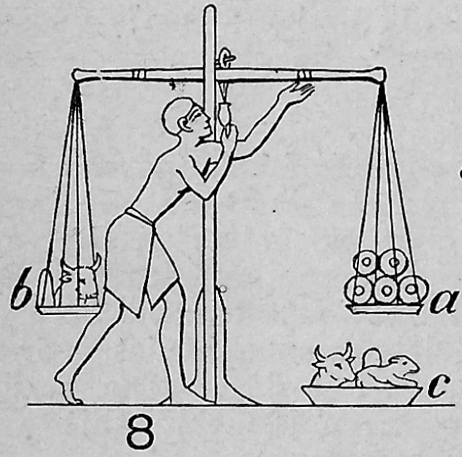 op een weegschaal volgens Egyptische voorstelling. Rechts de ringen (a) links het gewicht (b); deze gewichten (b en c) hadden een diervorm.
