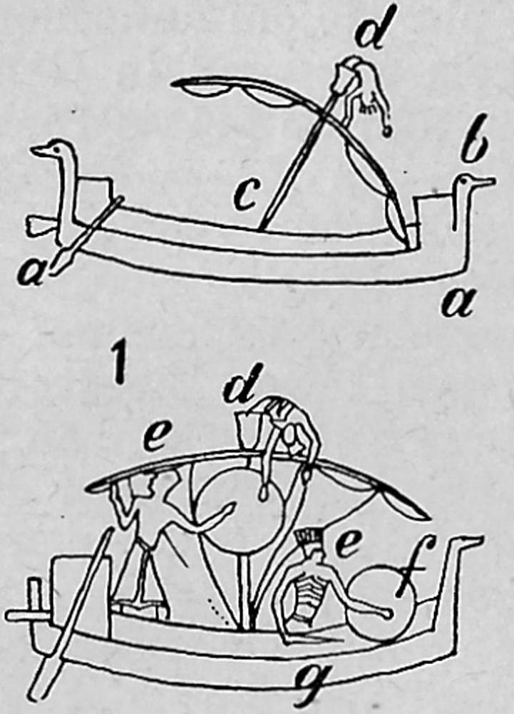 De Filistijnse schepen eindigden in een steil opstijgende voor- en achtersteven (a), versierd in de vorm van een zwanenhals (b). Het waren zeilschepen, die niet geroeid werden. De mast (c) heeft een mars of mastkorf (d). Op het onderste schip zijn twee Filistijnse krijgslieden (e); beiden hebben het voor de Filistijnen typische ronde schild (ƒ); de een draagt de eveneens voor dit volk kenmerkende dolk (g) in de rechterhand.