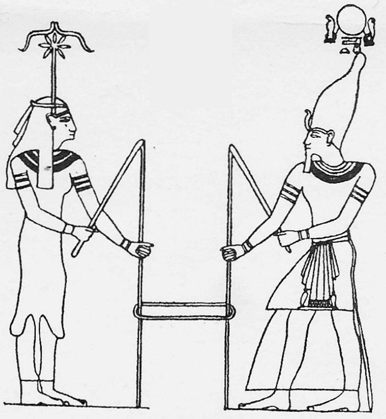 We zien twee figuren: een mannelijk figuur met de kenmerken van de priester en koning – en de vrouwelijke gestalte van de godin. Boven haar hoofd zien we een geometrisch figuur, een soort bloem. Beiden gestalten houden in de ene hand een rechtop staande staf en in de andere hand een stok die gebruikt wordt om de staf met een paar slagen in de grond te slaan. Omdat het gaat om een gewijde handeling, moeten de slagen in een bepaalde, voorgeschreven maat uitgevoerd worden. Rondom de beide staven is een touw zonder einde; de staven worden zo gehouden dat het touw steeds strak gespannen staat.