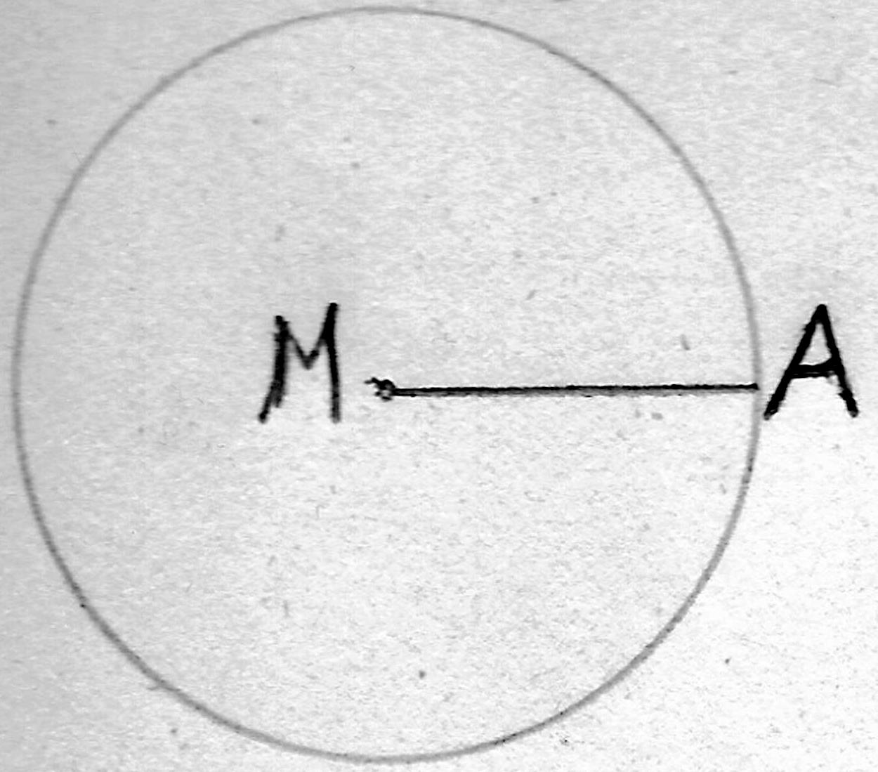 r blijft 5 en we tekenen nu vanuit A Ꙩ A. De snijpunten waar deze cirkel de omtrek van Ꙩ M raakt, noemen we B en C. Je ziet meteen dat AC een straal is van Ꙩ A en AB eveneens.