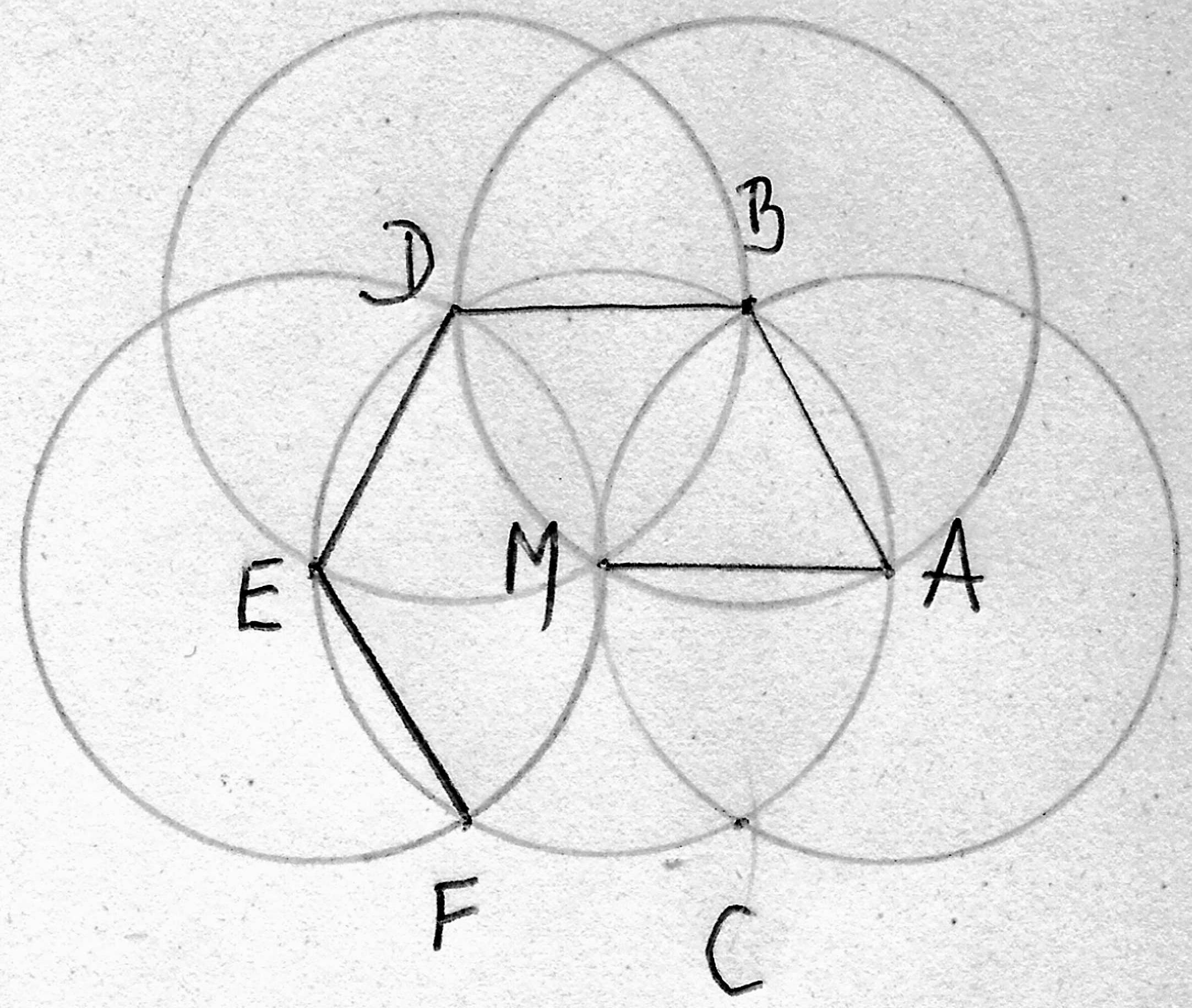 En we zien nu dat lijnstuk AD; DC; DB; DE; AB; BF even groot zijn, want het zijn dezelfde lijnstukken die we tussen de passer hadden toen we met de 1e cirkel begonnen.