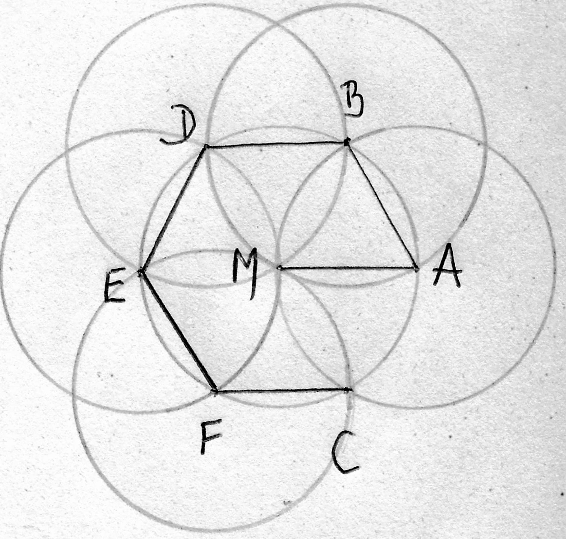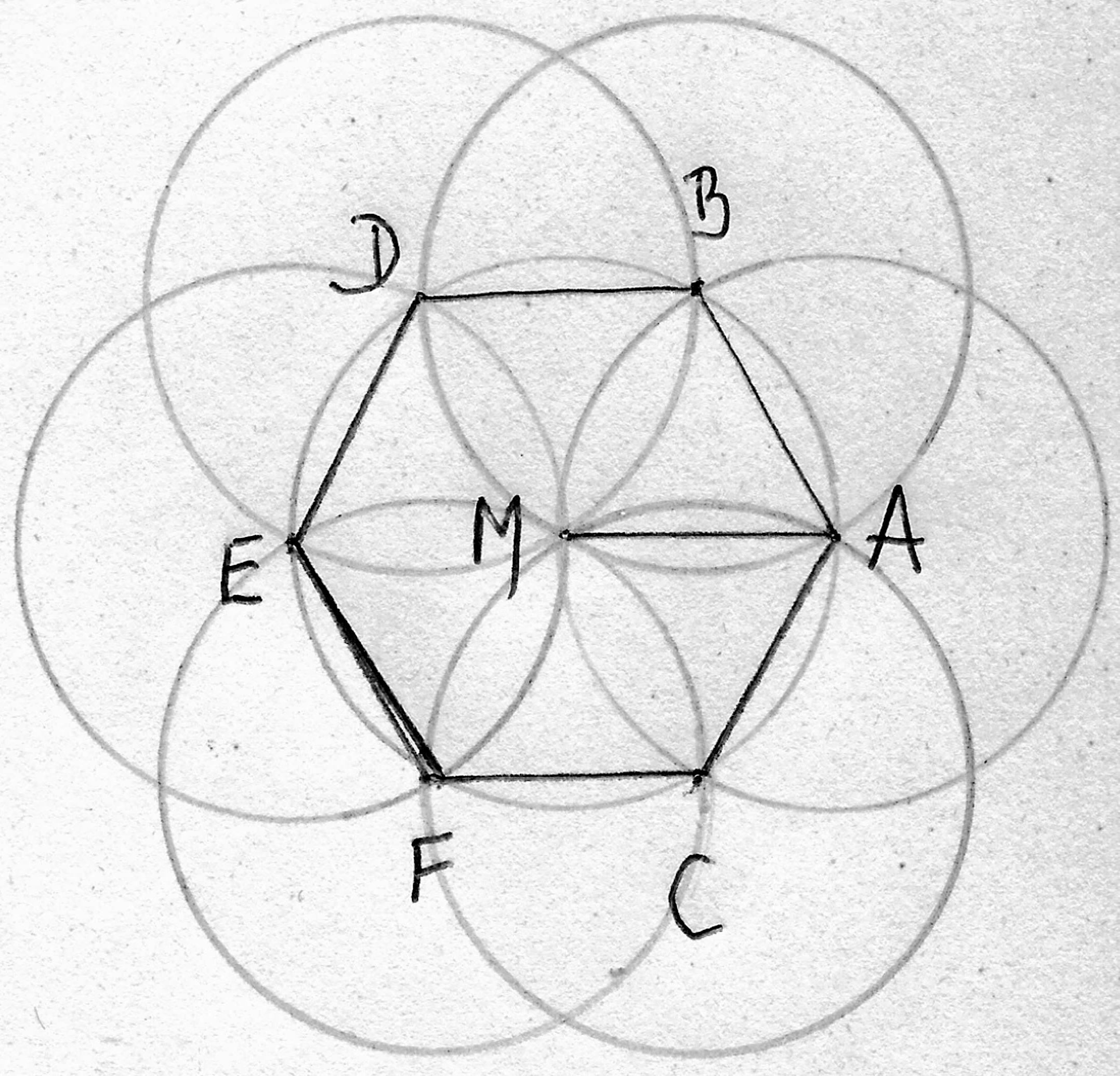 Dat betekent dat al deze lijnstukken evengroot zijn. Dat we hier 6 even grote stralen hebben en als we naar cirkel M kijken, hebben op die cirkelboog 6 punten gekregen die evenver van elkaar moeten liggen, omdat de afstand die tussen deze punten ligt dezelfde lijn is: straal MA.