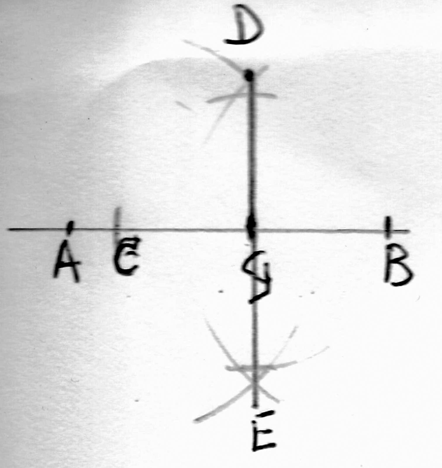 Je zorgt ervoor dat G in het midden komt te liggen door GB als straal te nemen en deze af te zetten op GA, snijpunt C. Nu ben je bij het uitgangspunt van de constructie om een lijn doormidden te delen. Je neemt de opening tussen de passer iets groter en cirkelt boven G om vanuit C en B. Snijpunt D. Vanuit G naar D getrokken is de gevraagde lijn de loodlijn. Je kunt hem ook doortrekken naar E als je vanuit C en B omcirkeld hebt.