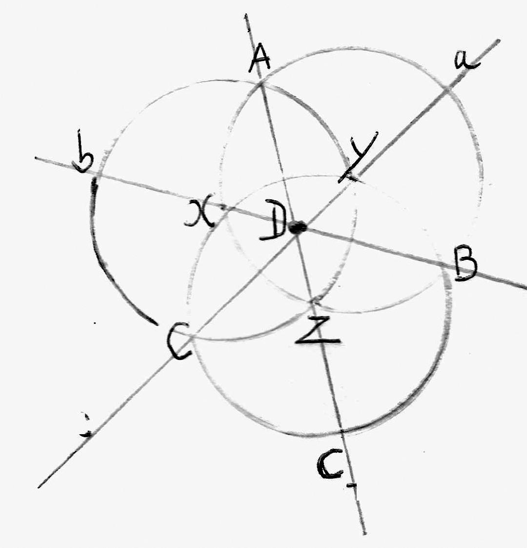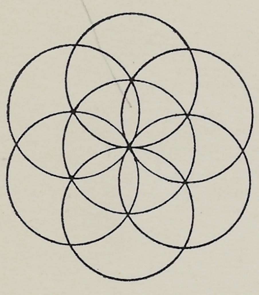 Teken eens drie cirkels X. Y, Z die ieder door het middelpunt van de twee andere gaan. Er ontstaan drie grote bladeren: AYZX; YZCX; XYBZ en door de punten van ieder blad trek je een rechte lijn: a, b en c. Het resultaat is het belangrijke feit dat deze drie rechten elkaar in één punt D snijden. Dat kan niet anders, want dan zouden de drie grote bladeren uit ongelijke boogstukken moeten bestaan. En dan zou echter iedere cirkel onmogelijk door het middelpunt van de beide andere kunnen gaan.