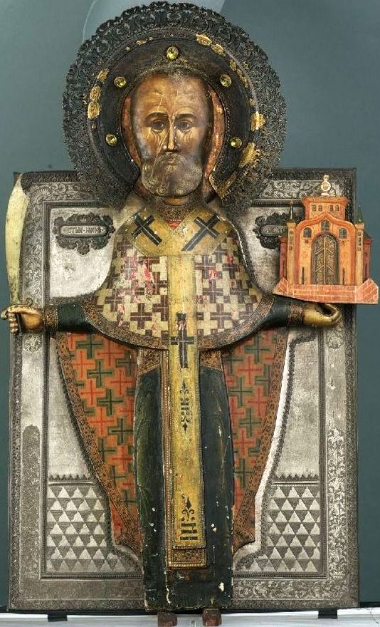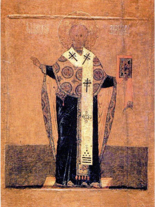 Vóór de invasie der Mongolen in de Xllle eeuw was er in Rusland één beeld van Nikola: hij was afgebeeld in een groen parament. Dat beeld stond te Kijew bij de heilige Sophia. Dat beeld verrichtte veel wonderen.