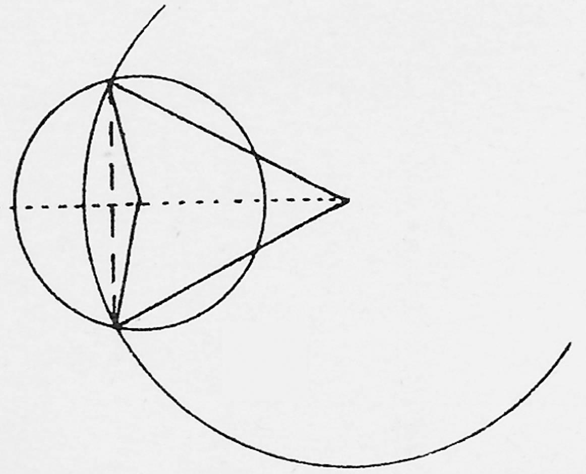 In bovenstaande tekening kunnen we de snijpunten van beide cirkels naar links laten lopen waarbij de rechter cirkel groter wordt en we kunnen waarnemen hoe deze zich steeds meer van elkaar verwijderen. De afstand zal het grootst zijn, wanneer het bovenste (snijpunt) het hoogste, het onderste het laagste punt van de cirkel heeft bereikt. Hun verbindingslijn gaat door het middelpunt en staat loodrecht op de centrale lijn; de deltoïde die uit twee gelijkbenige driehoeken ssamengesteld schijnt te zijn, is in één gelijkbenige driehoek veranderd, daar de linker driehoek steeds vlakker en tenslotte een rechte is geworden. Zoals op onderstaande tekening: