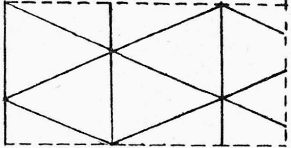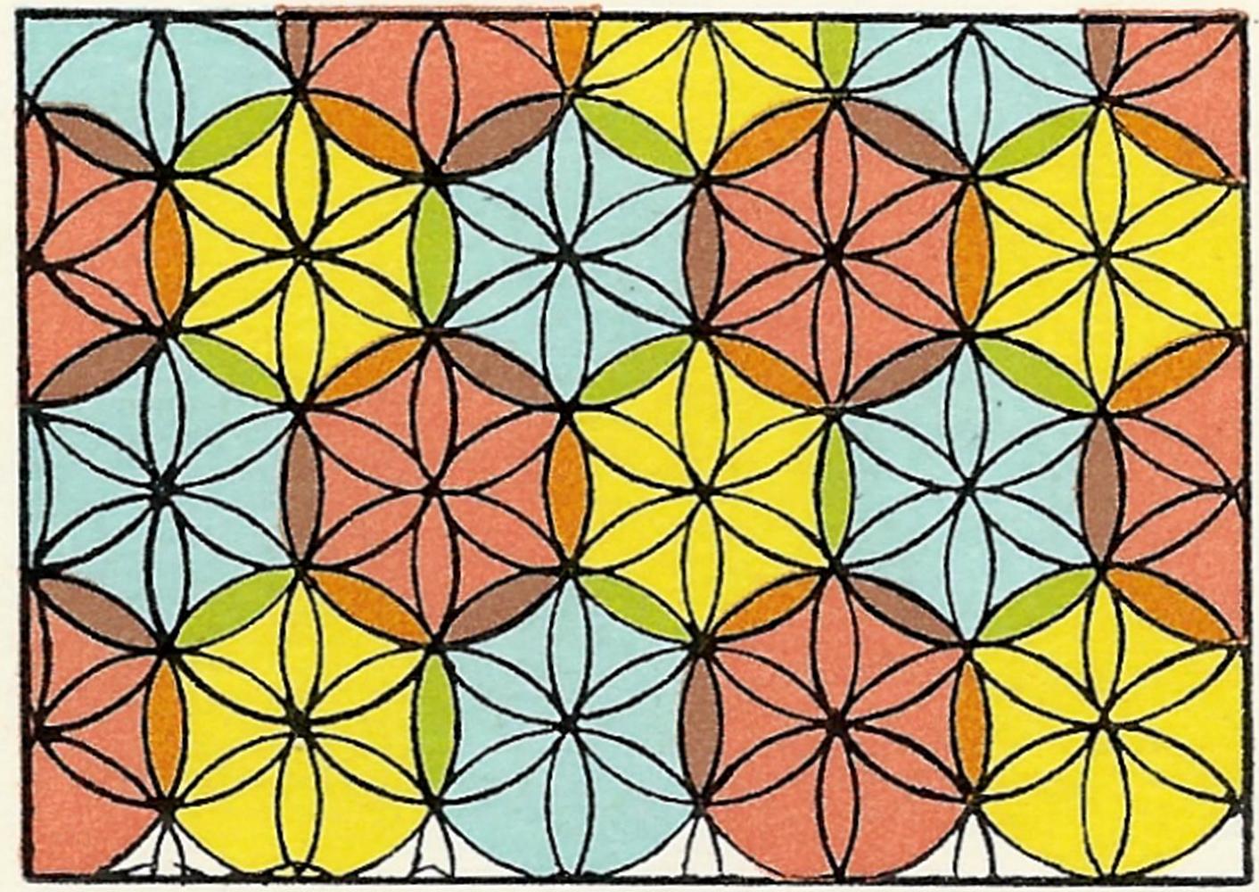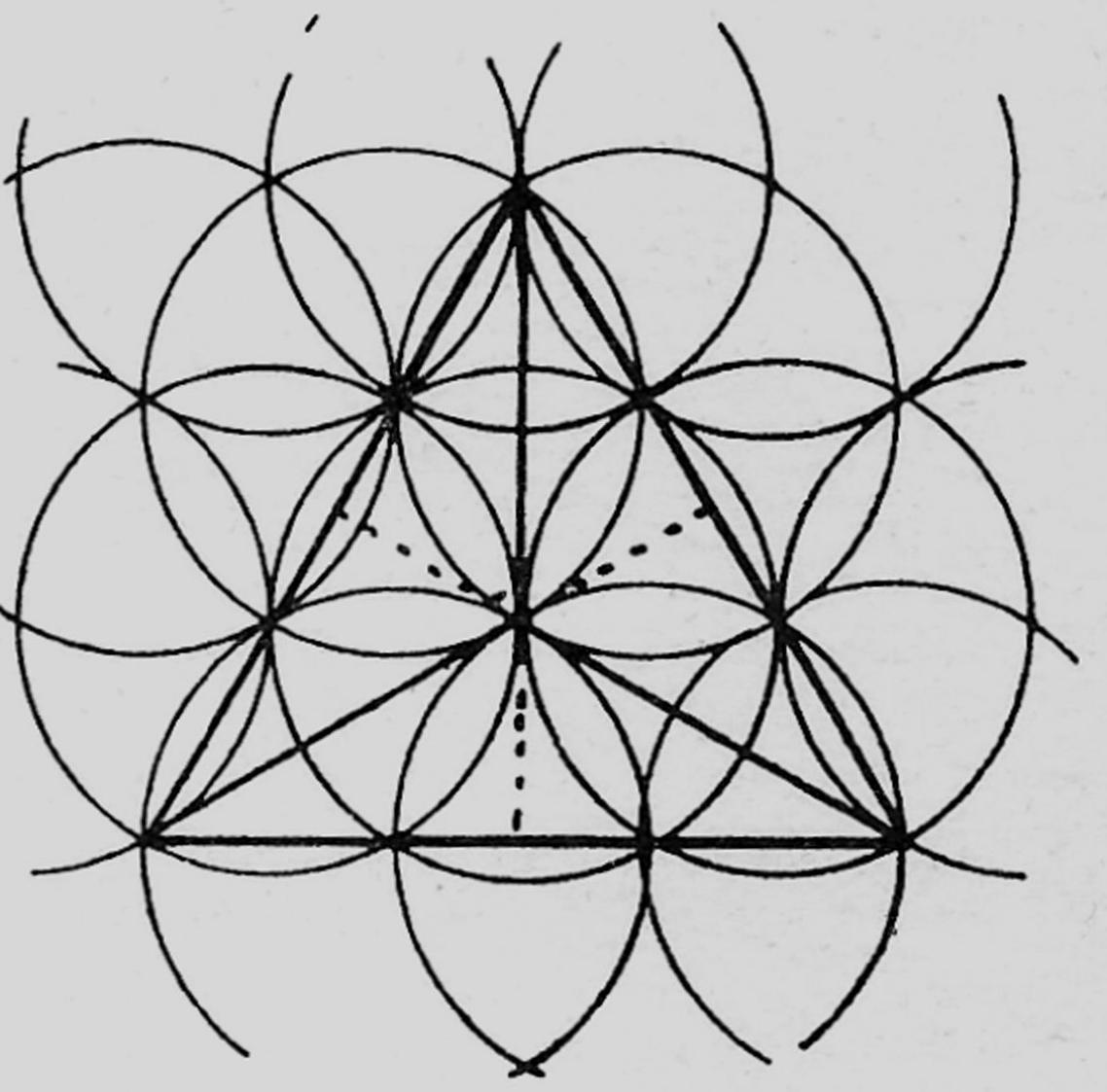Op het eerste gezicht zie je zulke driehoeken die de rechte lijnen als zijde hebben die je vanuit een punt van een ‘klein blad’ naar de andere kan trekken. Daar sluit zo’n lijn in dezelfde richting aan bij een volgende en heel het vlak vertoont zich als overdekt met drie paar parallel getrokken lijnen die met elkaar allemaal hoeken van 60º vormen. Voor de lengte van een zijde kun je een veelvoud van ‘kleine blaadjes’ nemen, ook van ‘grote’, steeds krijg je driehoeken met gelijke hoeken, gelijke zijden, de een aan de ander. Zo kun je met gelijkzijdige driehoeken heel het vlak opvullen, zonder dat er ruimte overblijft.