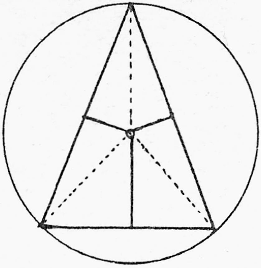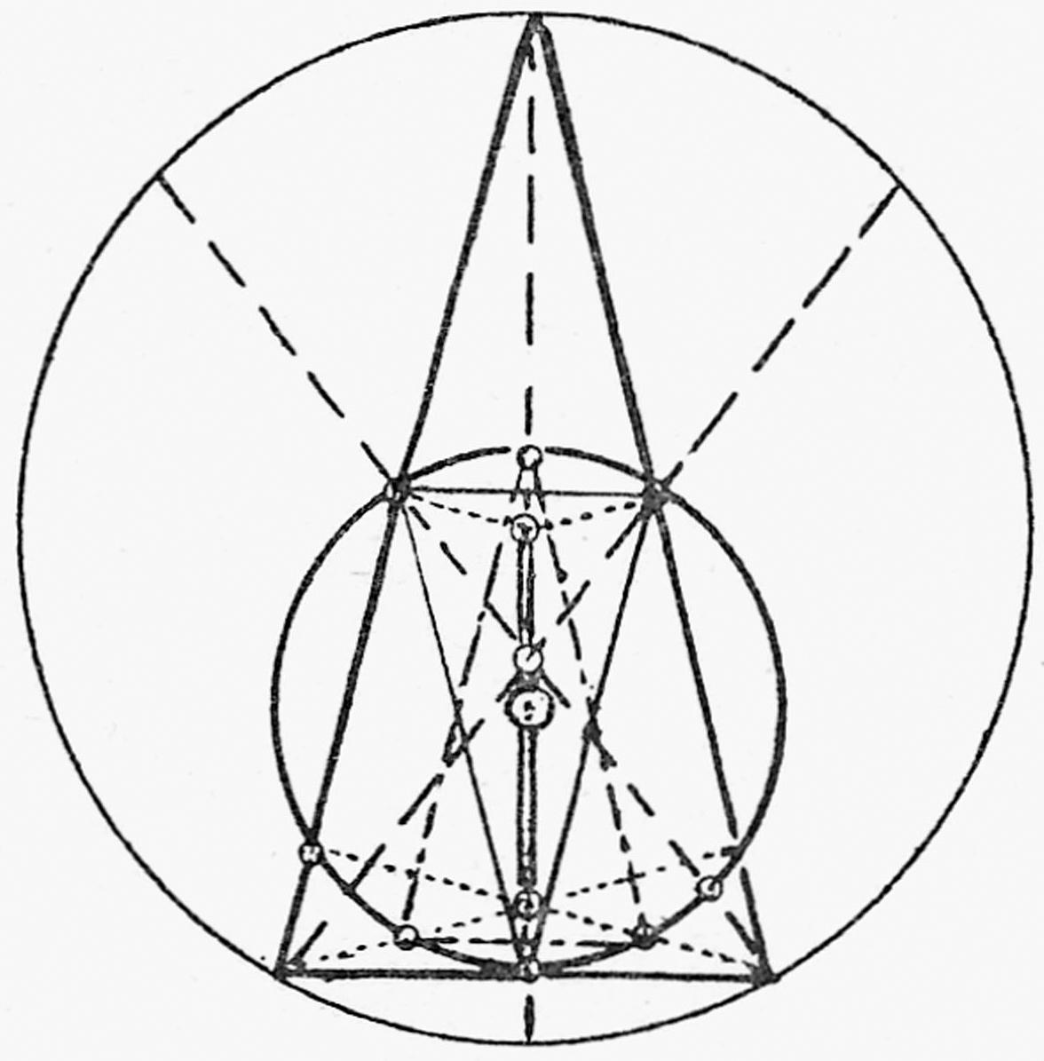 staat een gelijkzijdige driehoek met de omgeschreven cirkel en de cirkel die door het midden van de zijden, door de voetpunten van de hoogtelijnen en door de voetpunten van de middelloodlijn gaat. (Ook al vallen hier deze punten alle drie op een en dezelfde zijde, dan is het toch nuttig, dit feit te weten. Deze laatste cirkel heeft bij de gelijkzijdige driehoek ook de eigenschap, elk van de drie zijden in een punt, het middelpunt te raken. Het is een zgn. ingeschreven cirkel. Deze cirkel: zie volgende tekening: