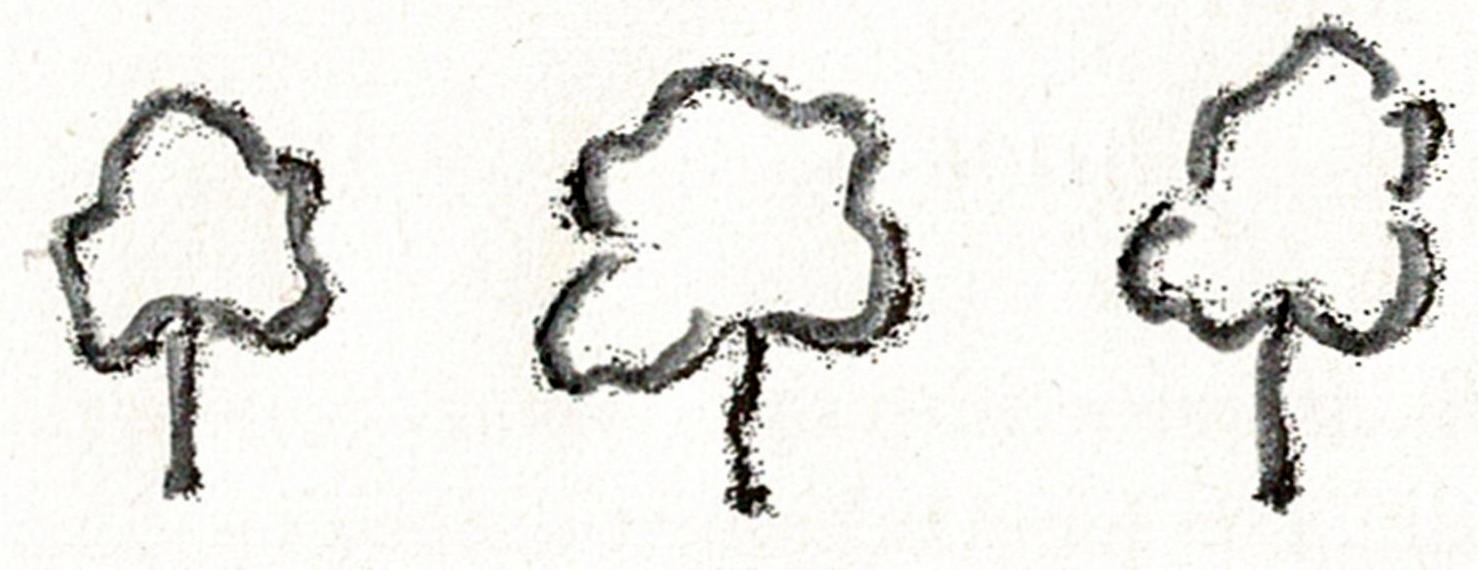 Karte, in die wir allmählich die Anschauung der Umgebung verwandeln, wirklich ein. Und wir zeichnen auch in diese Karte die Gebirgsverhältnisse ein. Es ist gut, wenn wir da mit Farben arbeiten, wenn wir die Flüsse blau einzeichnen, wenn wir die Gebirge mit brauner Kreide einzeichnen. Dann aber zeichnen wir auch in diese Karte die übrigen, mit den menschlichen Lebensverhältnissen zusammenhängenden Dinge ein. Wir zeichnen in diese Karte die verschiedenen Konfigurationen der Gegend ein, indem wir das Kind darauf aufmerksam machen: Sieh einmal, ein gewisser Teil der Gegend ist mit Obstbäumen bepflanzt und wir zeichnen die Obstbäume ein (siehe Zeichnung 1)