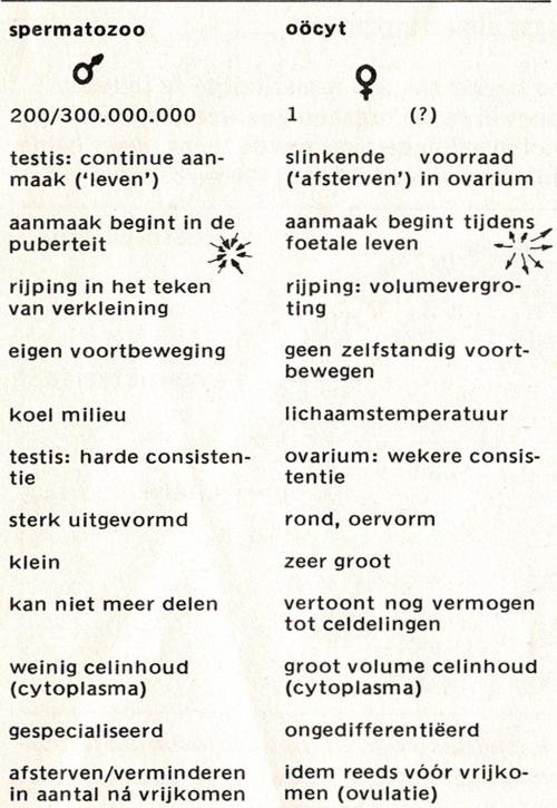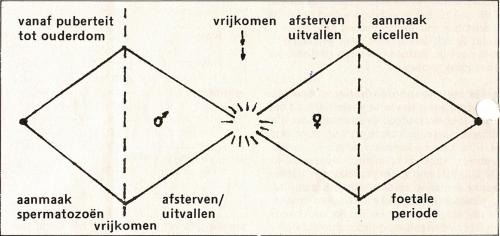 Laat ik beginnen hoofdrolspeler en -speelster het drama ten tonele te voeren. Om te beginnen is er de zaadcel, de spermatozoo. Met miljoenen tegelijk komen zij vrij: voor een redelijke kans op bevruchting zijn er, onder normale omstandigheden, minstens 100.000.000 nodig! De productie van deze enorme aantallen vindt continu, dag in, dag uit plaats in de manlijke testis (een woord dat mij altijd speelser en lichter voorkomt dan het Nederlandse equivalent teelbal of zaadbal). In de testis is er sprake van een gigantische celdelingsactiviteit, een ware uitspatting van leven die het orgaan bijvoorbeeld zo gevoelig maakt voor de celdodende werking van Rö-stralen. Deze aanmaak wordt gevolgd door een rijpingsproces van enkele weken, dat resulteert in de uiteindelijke spermatozoo, die naar men aanneemt, niet langer dan 2, 3 dagen in leven blijft en dan weer wordt afgebroken. In schijnbaar tegenstrijdigheid daarmee vindt deze uitspatting van celdelingen, van levensactiviteit zijn optimale condities in een koelere omgeving dan de lichaamsholte: 35° C is optimaal. Warmte is nadelig voor de spermatozoenaanmaak. Als de testes, wat bij kinderen soms gebeurt, tijdens de ontwikkeling in de lichaamsholte blijven liggen, komen zij niet tot activiteit, op het moment, dat dat normaliter gebeurt, namelijk bij het begin van de puberteit.