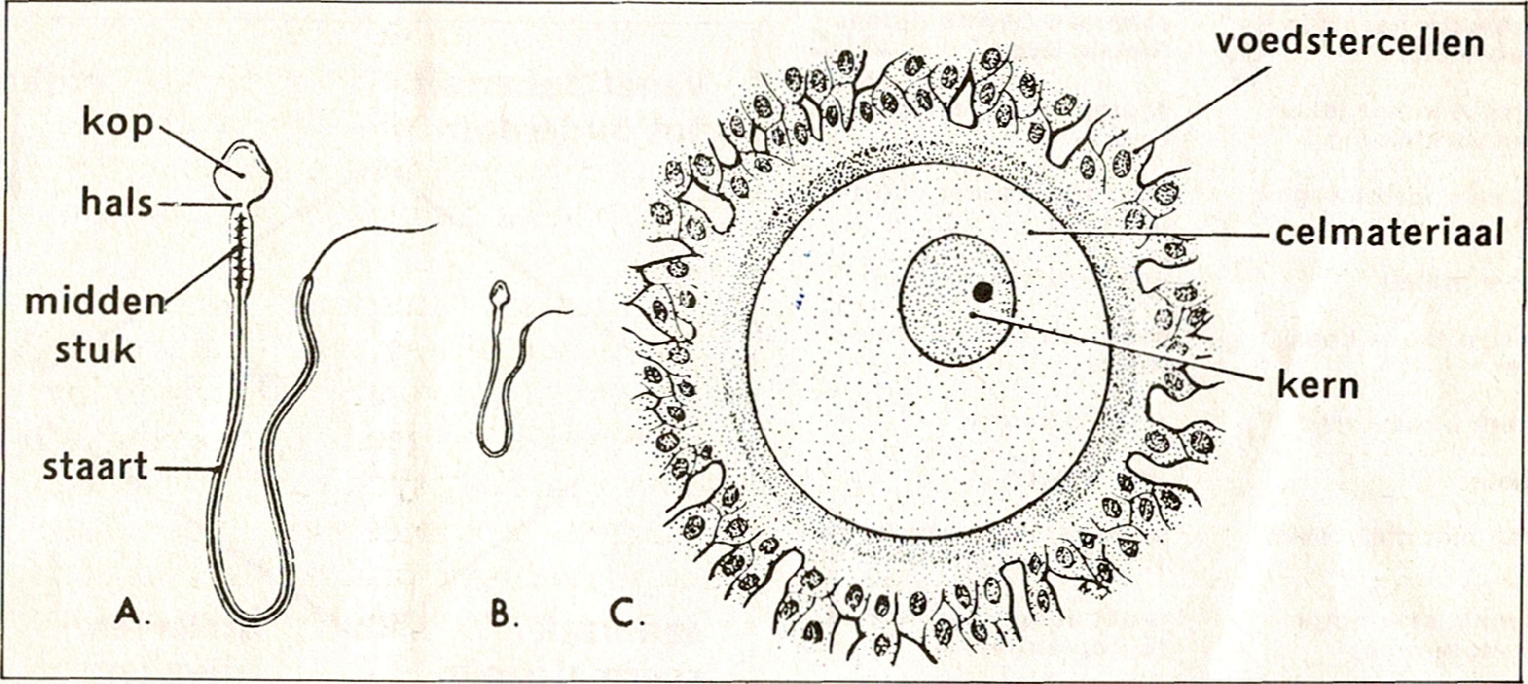 A. Spermatozoo. B. Spermatozoo op dezelfde schaal als C. C. Eicel of oöcyt met een krans van voedstercellen.