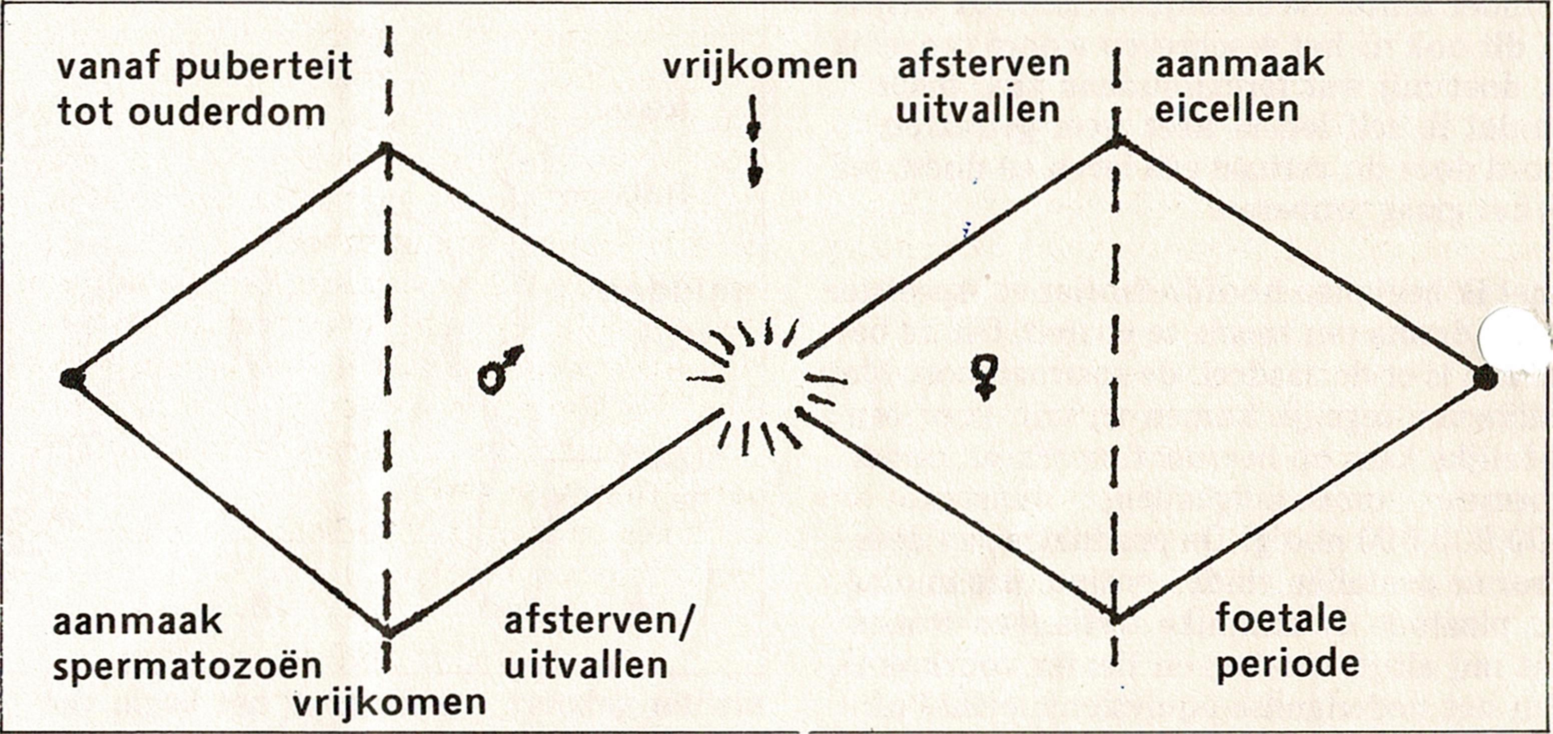Zo staan eicel en zaadcel tegenover elkaar ‘ een immense polariteit, waarin dood en leven op zo wonderlijke wijze vervlochten zijn. In gemetamorfoseerde vorm, en elke op volkomen andere manier zijn zaadcel en eicel de topjes van een piramide, eindpunt van een stroom, gedoemd te sterven. Tenzij zij elkaar ontmoeten en juist in deze ontmoeting van maximale eenzijdigheden opgaan en… vruchtbaar zijn: de bevruchte eicel, het ovum, nieuw leven. In de zaadcel en de eicel zijn het manlijke en het vrouwlijke maximaal uitgekristalliseerd, daarom zo eenzijdig, maar juist daarom zo vol mogelijkheden. Zoals in de top van de piramide de hele kracht van het bouwwerk ingesloten zit, maar in concreto niet aanwezig is. Het middelpunt van de lemniscaat. Op dat smalle punt van deze vorm, van de zandloper ontmoeten de beide stromen elkaar. Man en vrouw maken ruimte voor een nieuwe mens. Hun ontmoeten is essentieel daarvoor, hun terugtreden evenzeer: het kind is niet van de ouders, het kan wórden, dankzij die ouders. De levenstroom van aanmaak van eicellen en zaadcellen komt tot stilstand in die ene zaadcel en eicel, en dat kan het startpunt worden van de miljarden celdelingen die daarna aan de vorming van een nieuw menselijk individu zullen bijdragen.