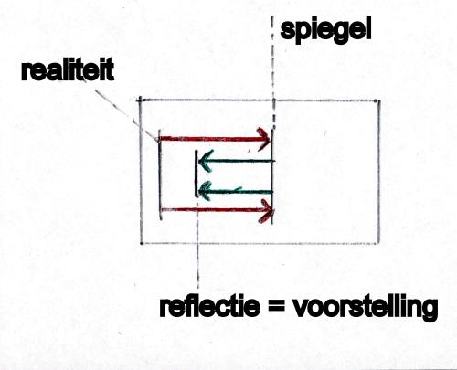 De muur is hier ‘de spiegel’; voor het denken de spiegelende functie van het aan de fysieke hersenen gebonden denken.