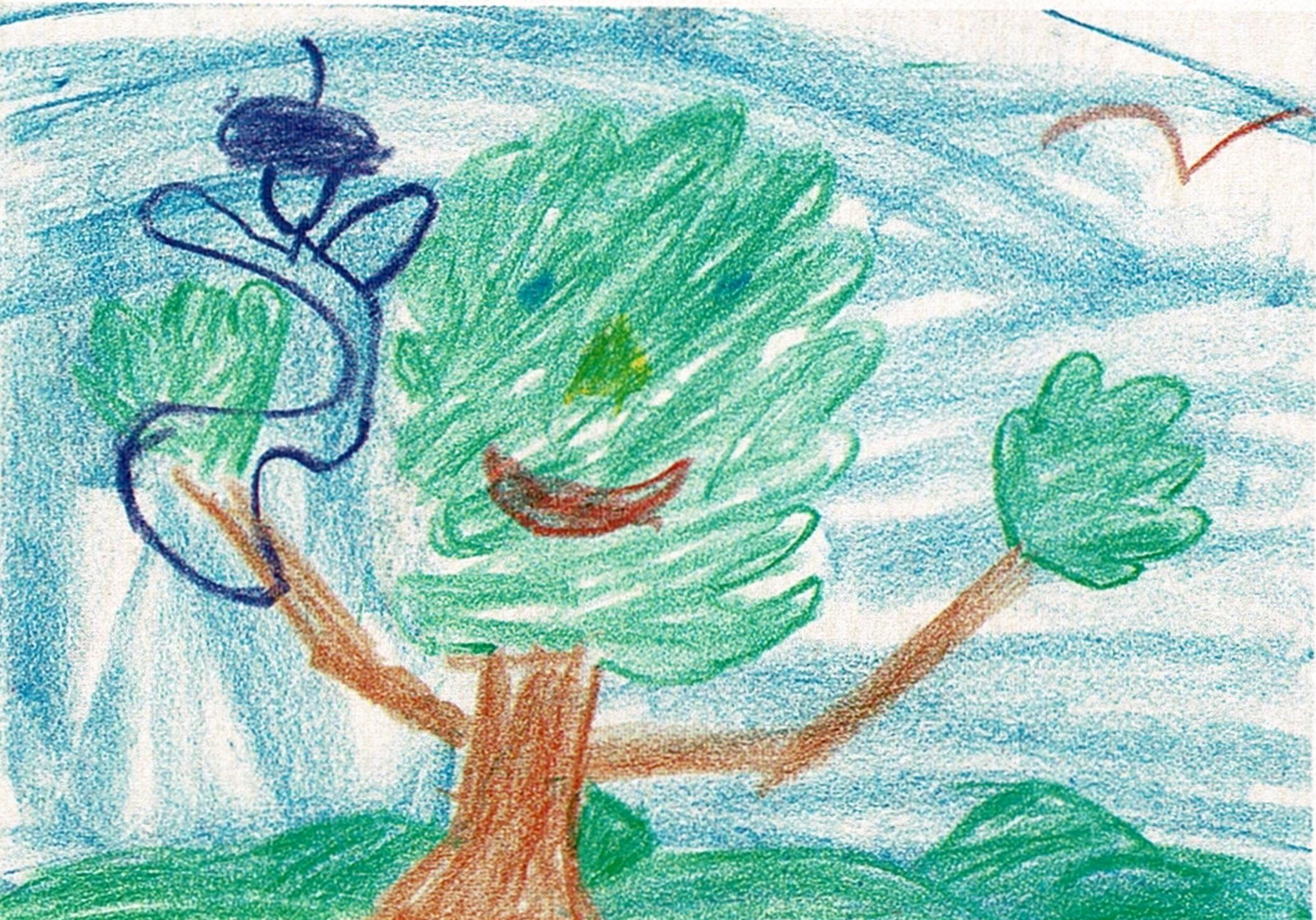 afb.14: ook hier kijkt het kind uit de kroon van de boom – het veld van ervaringen breidt zich uit, zoals ook de armen die wijd uitgestrekt zijn