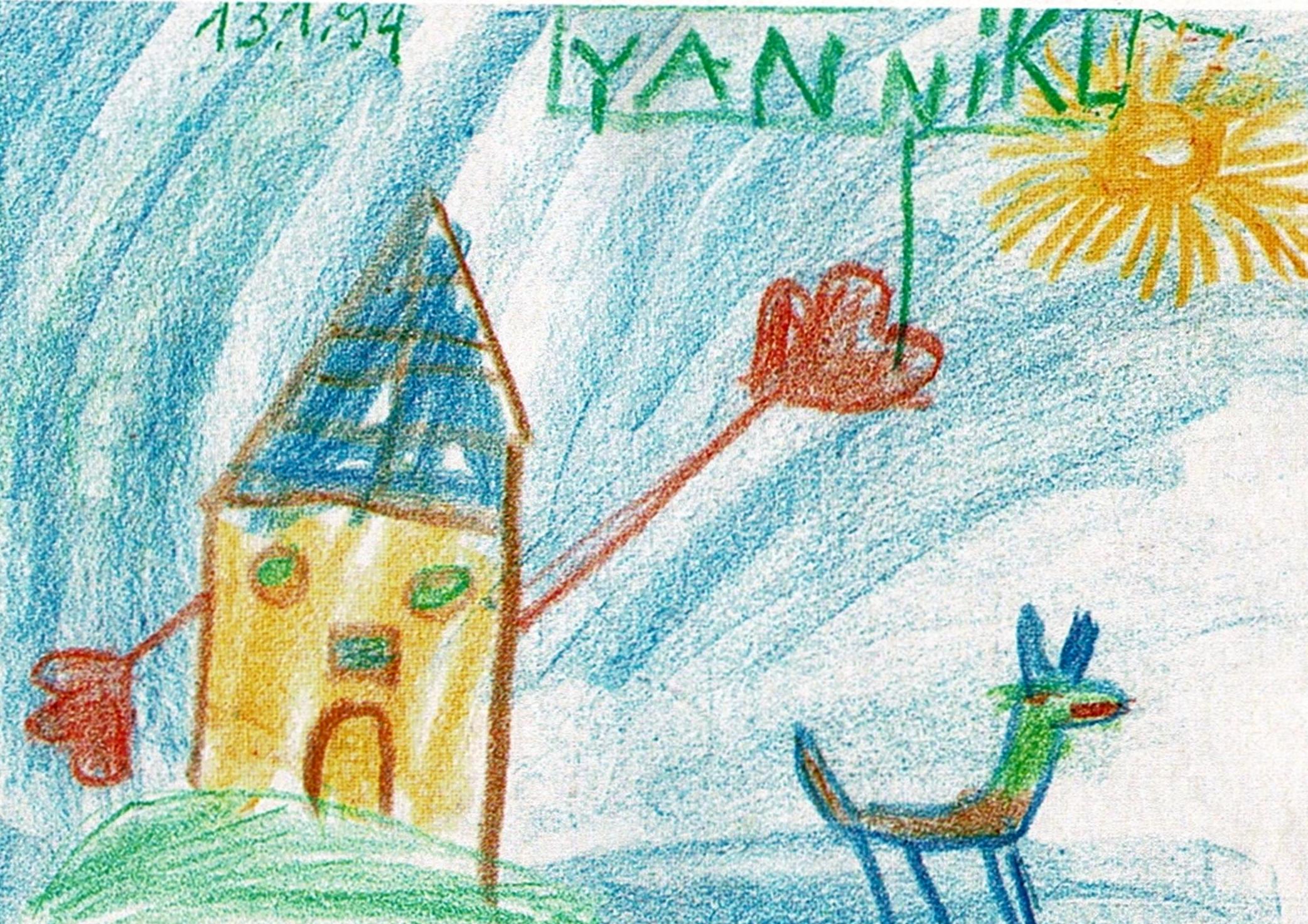 Zoals je aan het spel van de kinderen ontwikkelingswetmatigheden kan aflezen, kun je dat ook aan de vormentaal van de tekeningen van de kleine kinderen en deze zijn weer nauw verbonden met de lichamelijke ontwikkeling. Het woord kindertekening laat de eigenlijke betekenis van de beelden niet zien, want het zijn getekende aantekeningen, dagboeknotities van een ontwikkeling die een kind doormaakt. In een beeld uitgedrukt kun je zeggen: het zijn aantekeningen over hoe de ziel een huiselijk plekje inricht in de lichamelijke woning. Tekent een klein kind een huis dan is dat altijd een beeld voor het eigen lichaam, het is geen afbeelding van de wereld om hem heen. Afb. 1