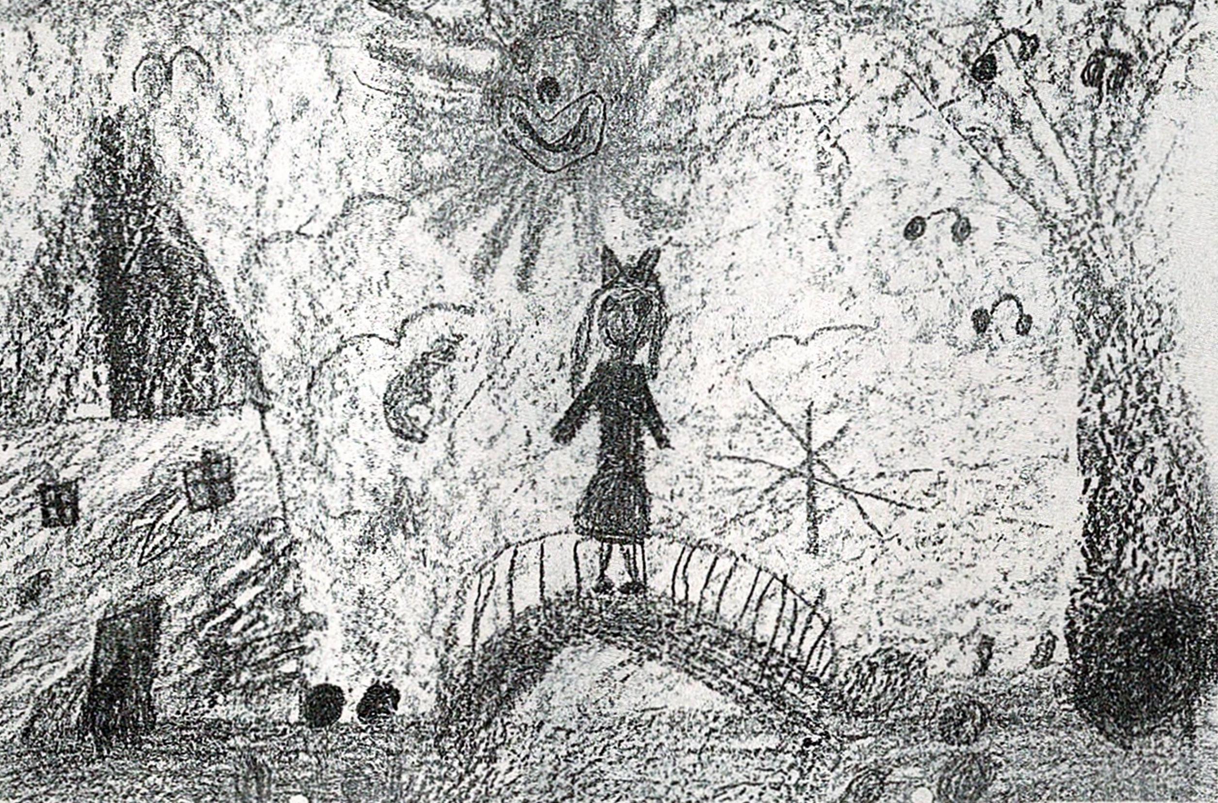 Een laatste, zeer geheimzinnig motief zijn de bruggentekeningen. Heel vaak worden ze door kinderen getekend in het laatste jaar voor ze naar de basisschool gaan. We vinden eigenlijk steeds een brug die over een water leidt, een kind op de brug, of er op begonnen te lopen, dikwijls een huis aan de ene kind, een boom op de andere oever. Afb. 23: