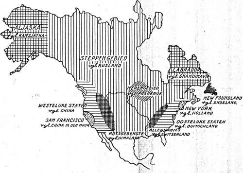 Verdere vergelijkingen kunnen gemaakt worden: als parallel van Duitschland met zijn vele staten (onderscheiden in Noord en Zuid) heeft men het Oosten van de Vereenigde Staten (die evenzeer in Noordelijke en Zuidelijke Staten onderscheiden werden van ouds); dit Oosten herhaalt zich in het Westen, nadat het in het uitgestrekte steppengebied van het centrum en van Canada een parallel gevormd heeft van Rusland en Siberië. Het Oeralgebergte brengt nog een scherpe afscheiding tot stand tusschen Rusland en Siberië. Alle vormingen in Amerika loopen meer in elkaar. Misschien kan men hier spreken van een scheiding tusschen Oost en West door de Mississippi.