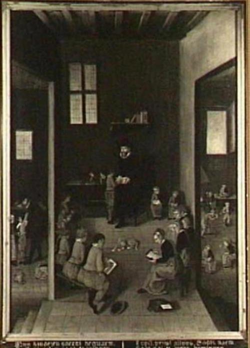 Dit schilderij van een onbekende uit het begin van de achttiende eeuw toont duidelijk dat men vroeger het begrip „kind” in onze betekenis niet kende. De wezen, die hier ongetwijfeld godsdienstonderricht genieten, zijn geen kinderen, maar houten klaasjes met oudewijvensnoetjes.