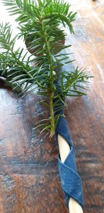 Vervolgens een takje groen, dat je gewoon met doorzichtig plakband vastplakt. Altijd lager dan het vlammetje van de kaars!