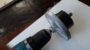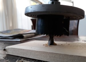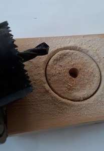 Zaag met een gatenzaag met een doorsnee van 6 à 7 cm een rondje uit het materiaal. Zorg ervoor dat de boor van de gatenzaag niet dikker is dan de doorsnede van het rondhout.