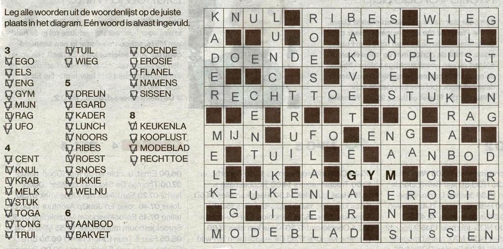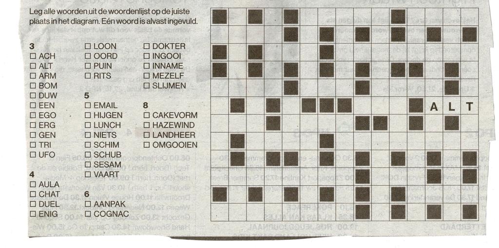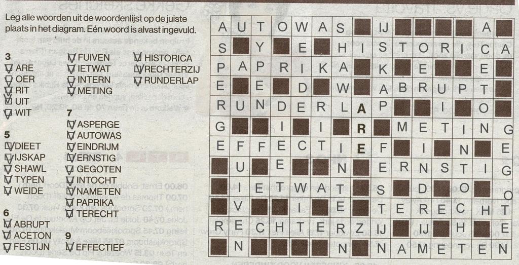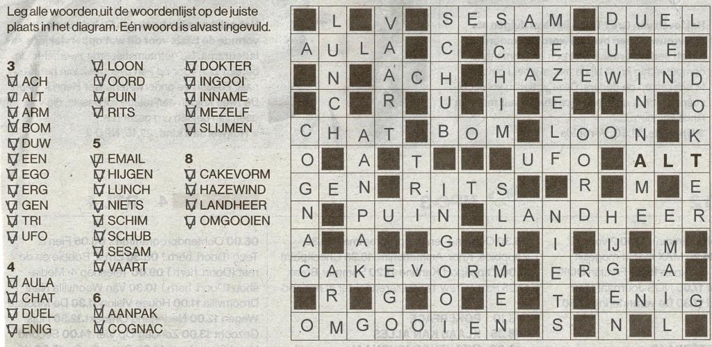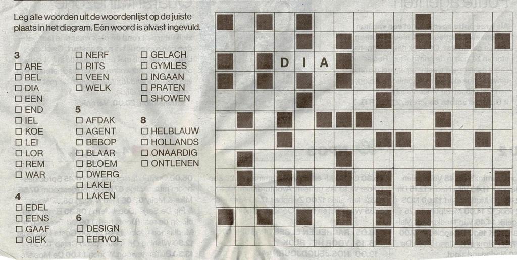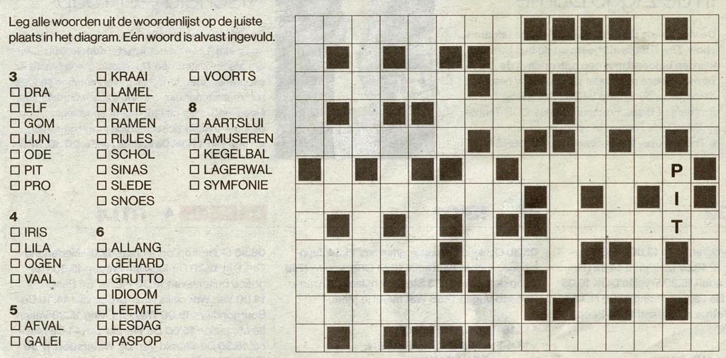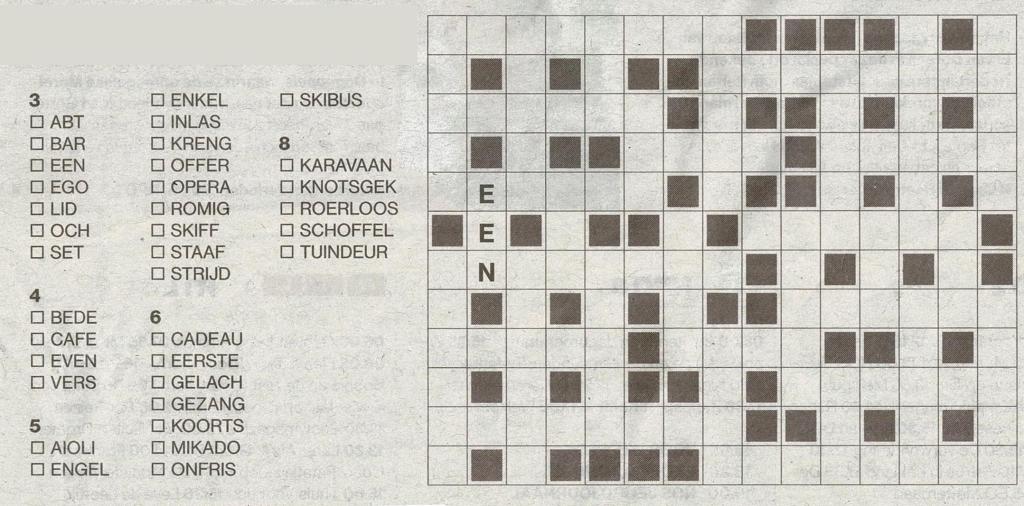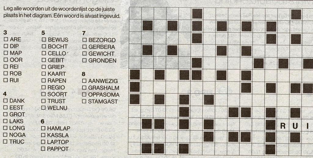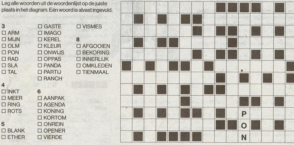Kun je onderstaande woorden zodanig in het diagram invullen dat een kloppend kruiswoordraadsel ontstaat? Eén woord is al voor je ingevuld.