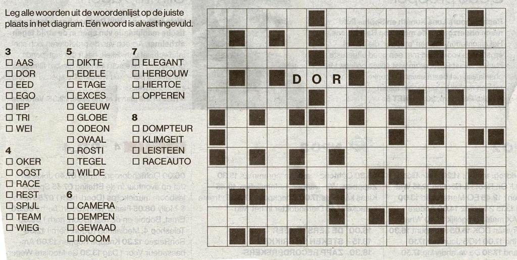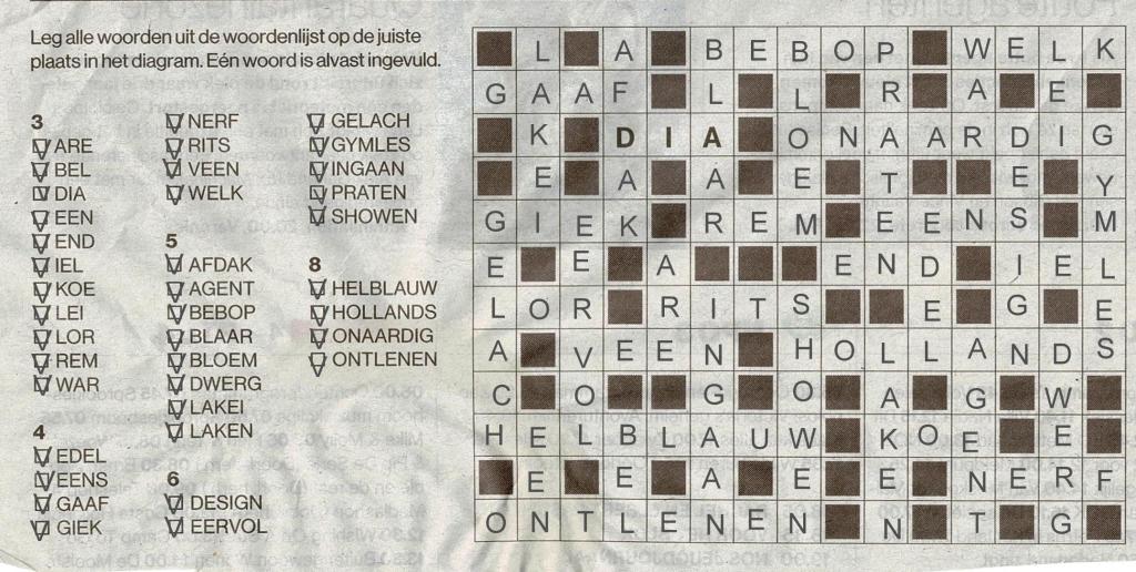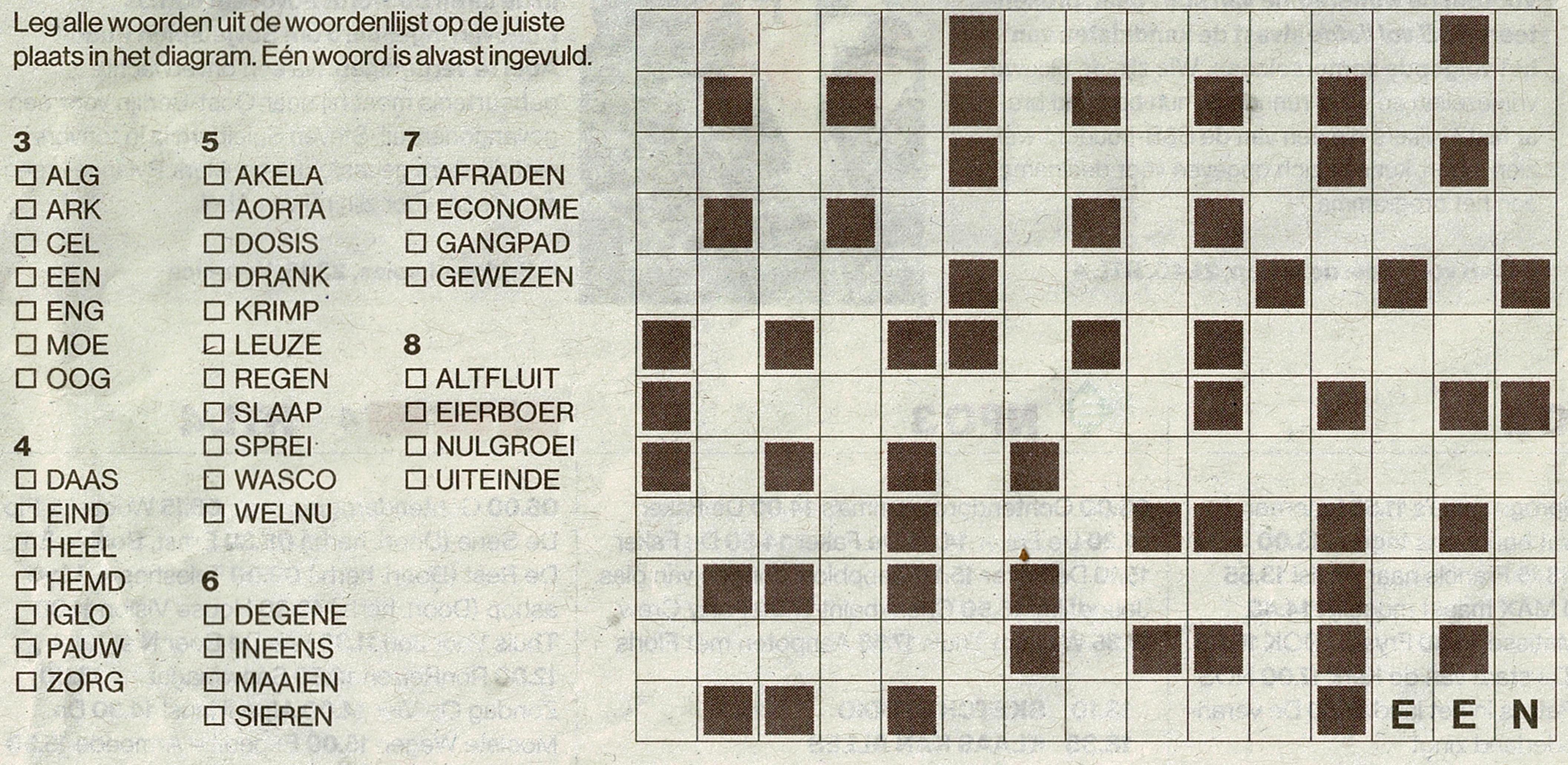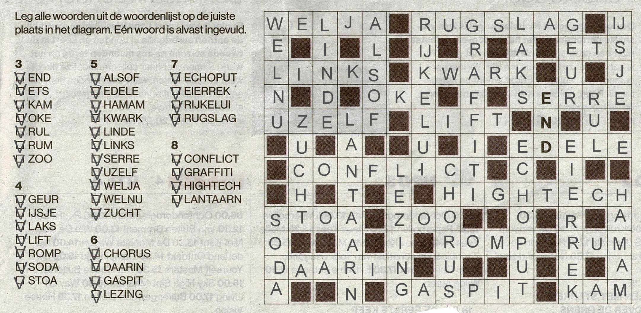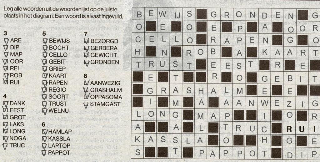 Kun je onderstaande woorden zodanig in het diagram invullen dat een kloppend kruiswoordraadsel ontstaat? Eén woord is al voor je ingevuld.