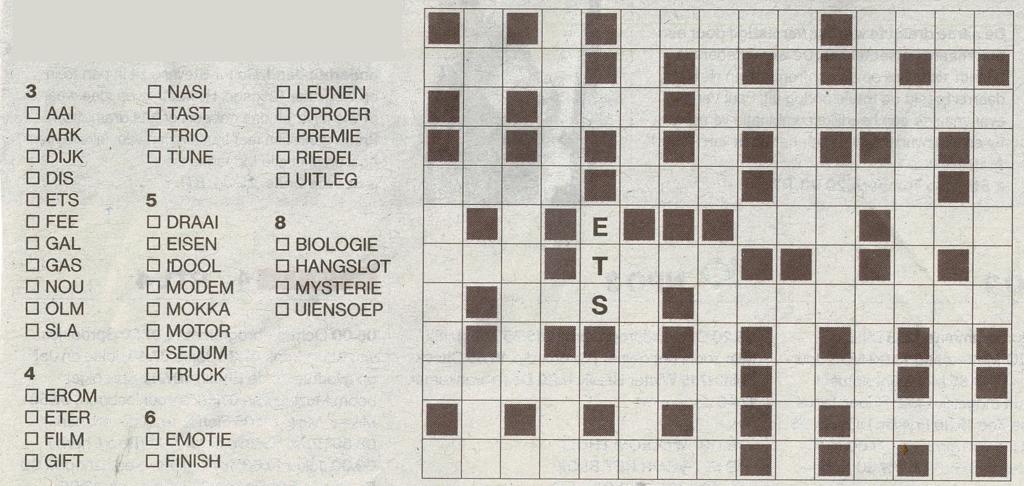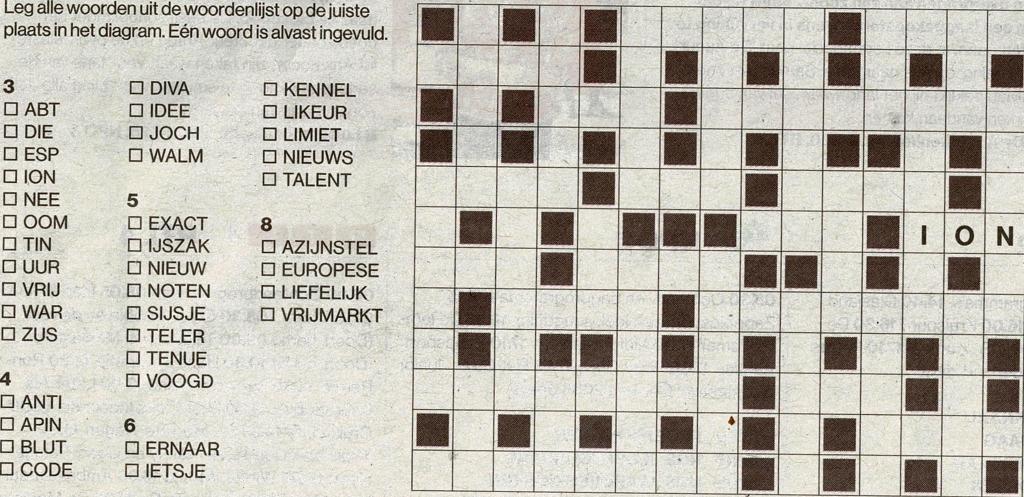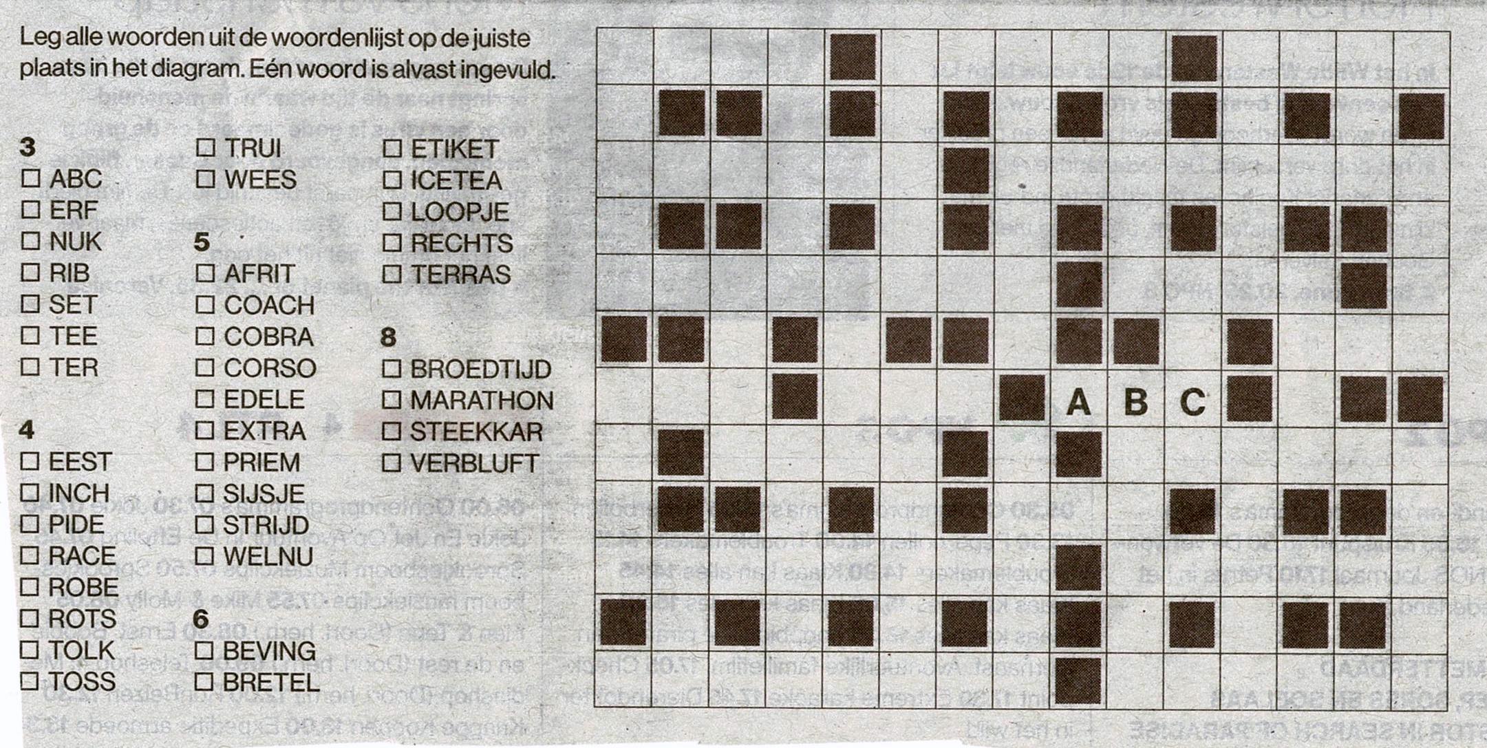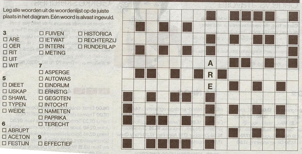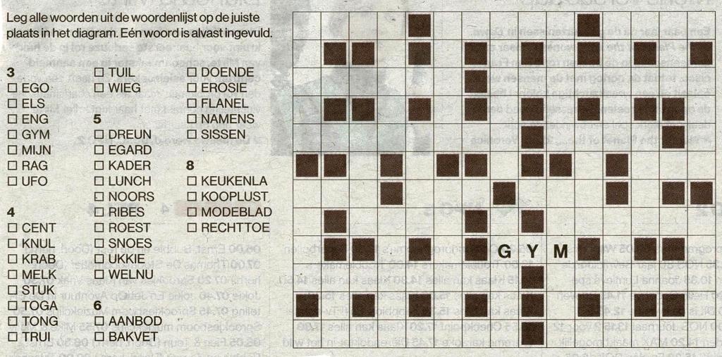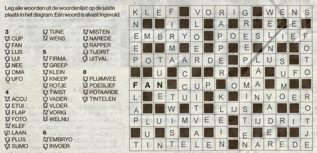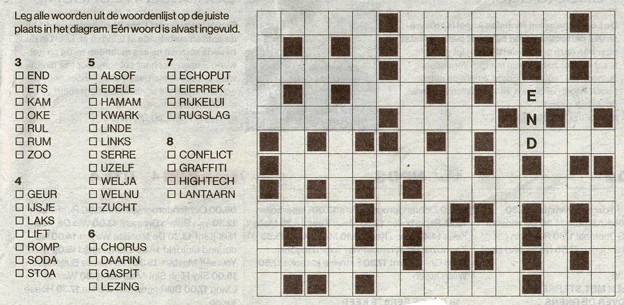 Kun je onderstaande woorden zodanig in het diagram invullen dat een kloppend kruiswoordraadsel ontstaat? Eén woord is al voor je ingevuld.