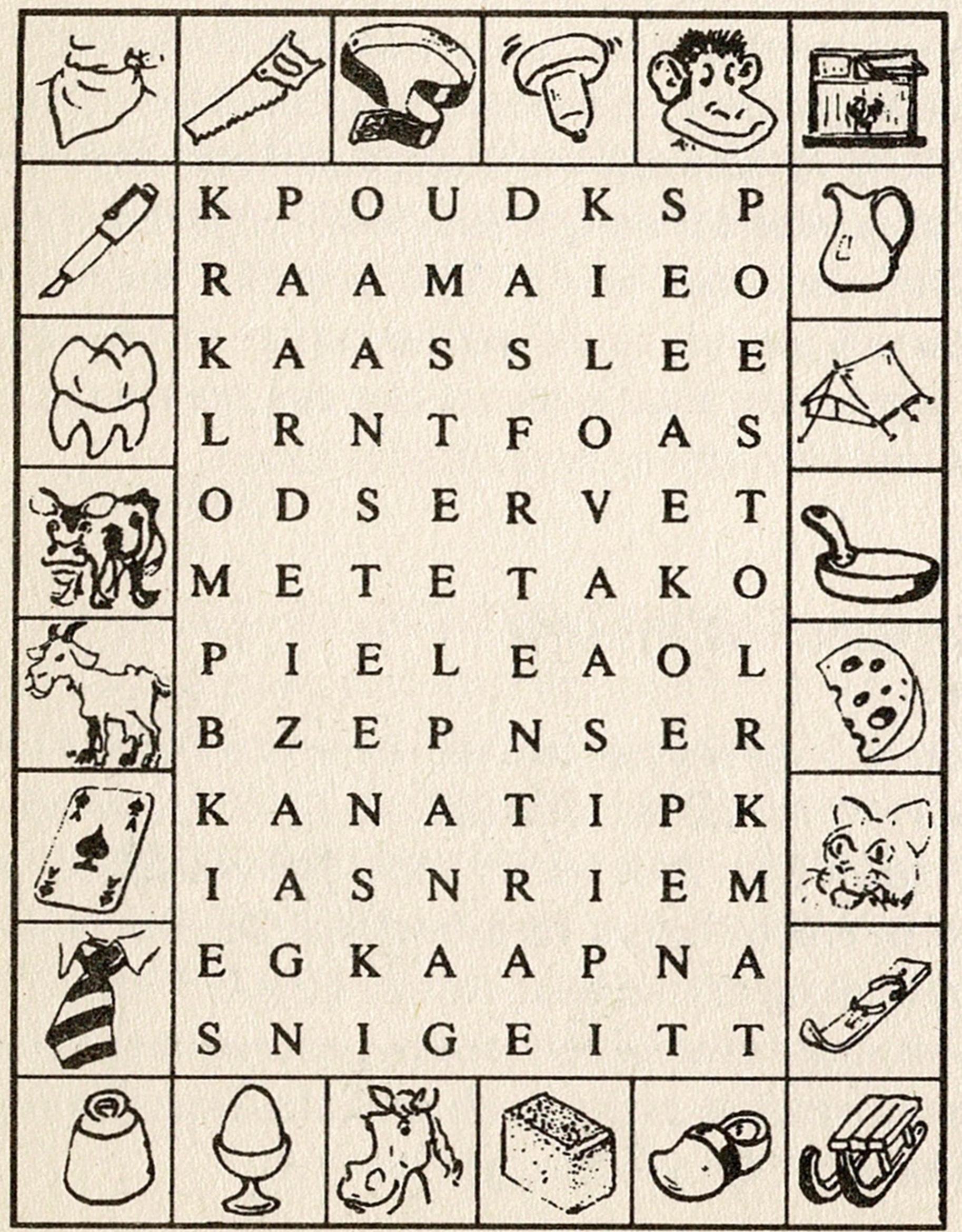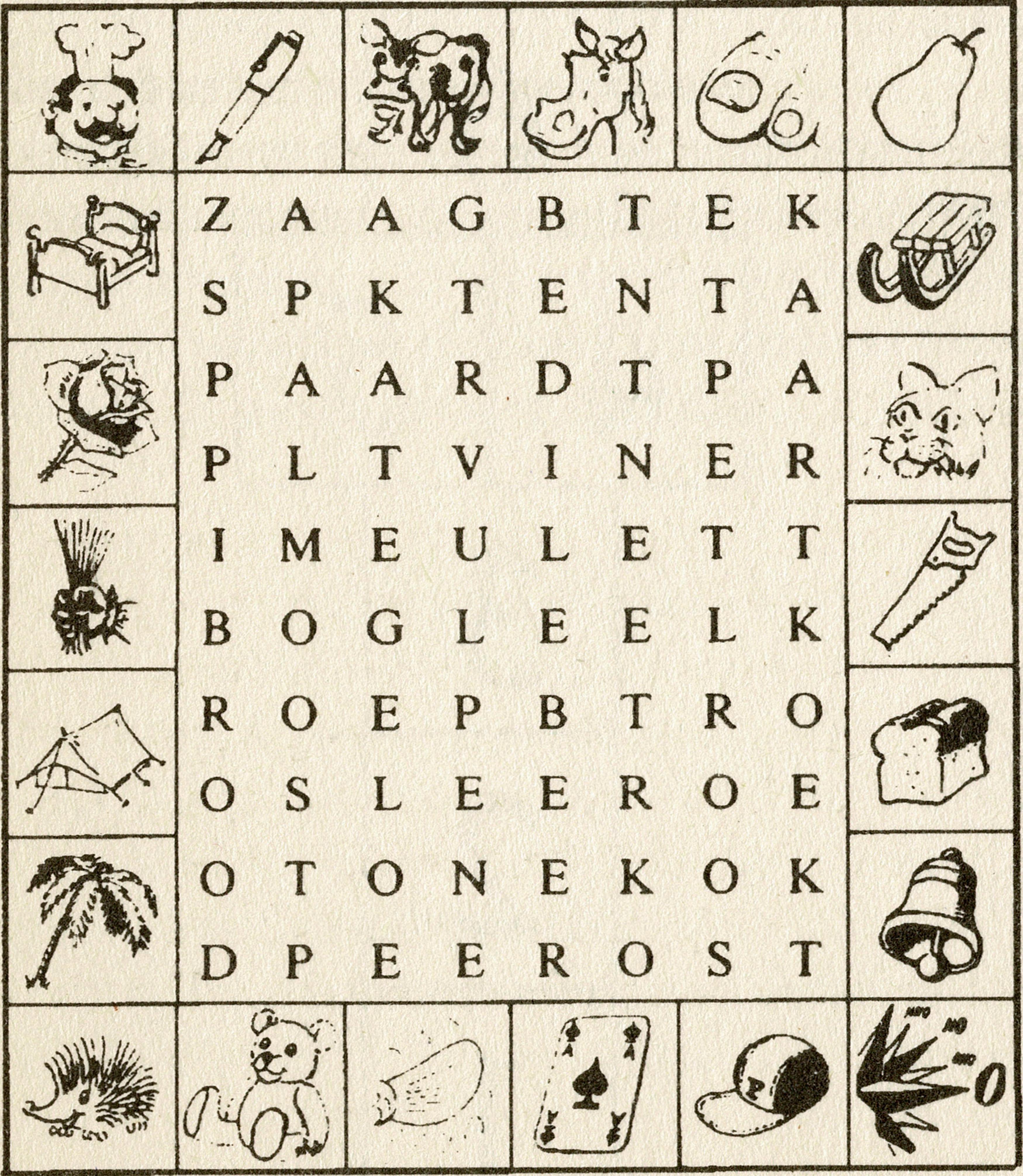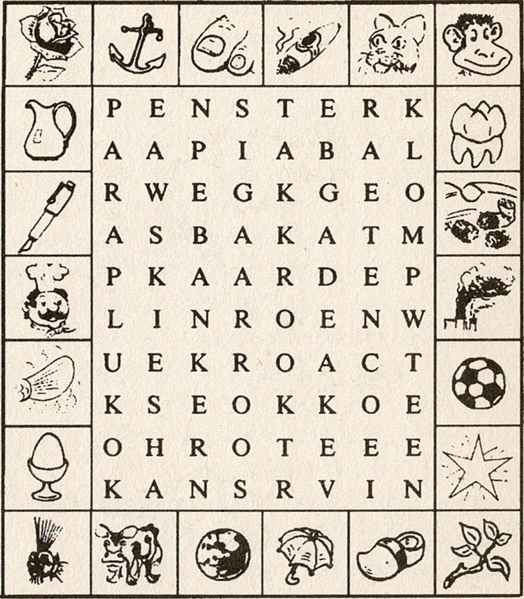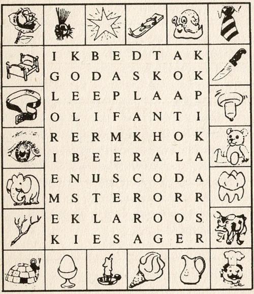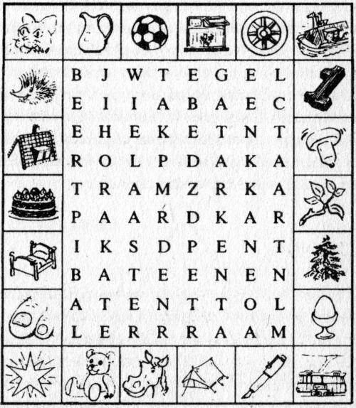 Streep de woorden van de plaatjes door. Soms van links naar rechts, soms van boven naar beneden (niet omgekeerd en niet schuin)
