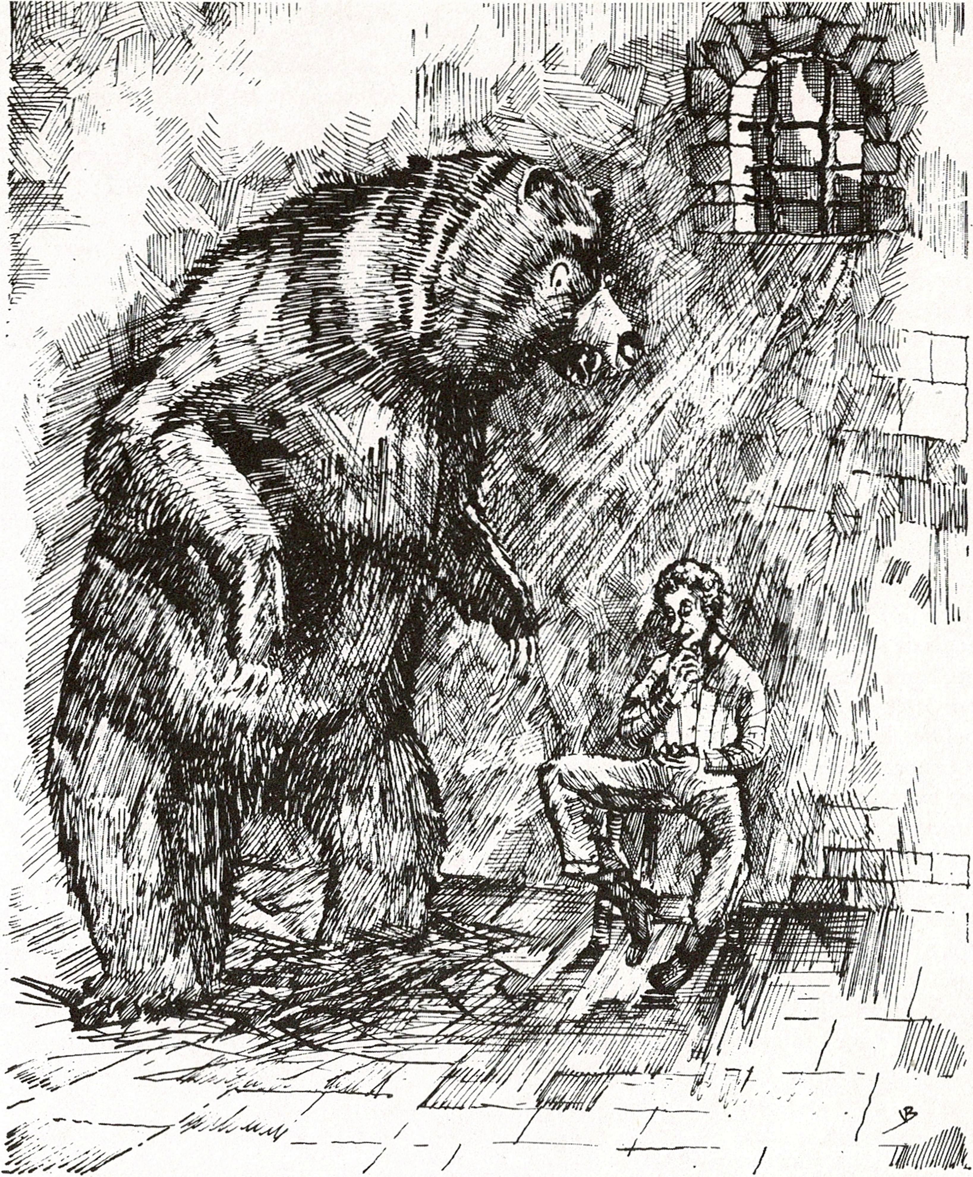 De tweede opdracht voor het snijdertje is belangrijker. Hij moet het met de beer in de kelder zien uit te houden. De beer beweegt zich weliswaar op vier poten, maar kan toch ook op twee poten rechtop gaan staan, wonderbaarlijk mensachtig en hij kan zelfs dansen.