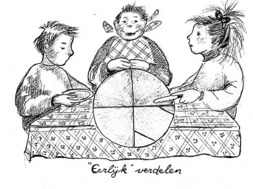 Maandagmorgen, de eerste breukenperiode. Geen hoopvolle stille verwachting, maar een klas met druk pratende kinderen nog vol van alle weekendbelevenissen. We zingen samen een lied en worden in deze beweging weer ‘één’ stem. Dan zeggen we met elkaar de spreuk en als de kinderen daarna, toch stil geworden, zitten te wachten, haal ik triomfantelijk de theedoek van de schaal op het tafeltje midden voor de klas: één pannenkoek! “Jongens, deze pannenkoek gaan we nu opeten.” “Geef maar aan mij, want ik had toch geen tijd om te eten vanmorgen”, zegt Erik met een grote grijns. Nienke, altijd oog hebbend voor het geheel van de klas, verwijt me “U had er beter 24 kunnen bakken, zo is het toch niet eerlijk!” Nog vele opmerkingen volgden, snel wordt duidelijk dat er gedeeld moet worden. Henk, die altijd trek heeft, probeert nog even “Wie wil er niet?” “Henk, weet je wat, neem jij het mes, maar waarom vraag je dat eigenlijk?” “Als Erik en ik nou alleen wilden, dan hadden we ieder de helft!” Luid gejoel uit de klas maakt onmiddellijk duidelijk dat Henk op een andere manier moet verdelen. Een hele puzzel, maar ieder kind kon even later een sliertje pannenkoek in zijn mond stoppen.