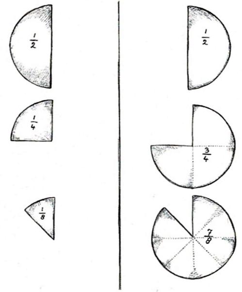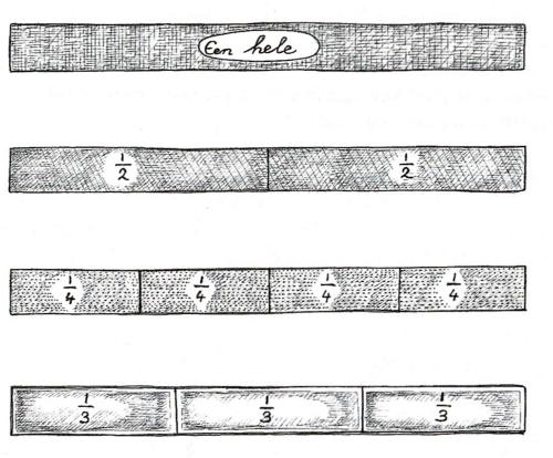 Het is voor de kinderen een grote verrassing, soms haast een schok als ze bemerken dat binnen het geheel van het getal 1 een totaal nieuwe rekenwereld ligt. De eerste kennismaking met de breuken staat in het teken van ‘concrete’ zaken, zodat de kinderen in de wereld van de breuken thuis kunnen raken. We kunnen daarbij denken aan het volgende: