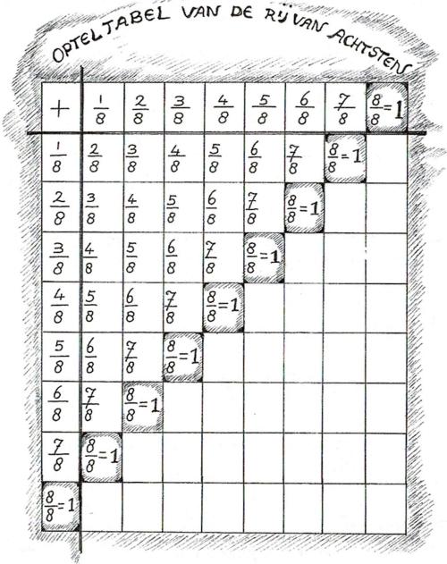 Ten slotte wordt er zuiver met breuken gerekend, in elk geval door de leerlingen die dat aankunnen. Deze leerlingen gaan nu (pas) op zoek naar achterliggende rekenregels. Niet alleen de regels, maar ook het waarom ervan. Het gaat er natuurlijk niet om die regels domweg te leren, dat hebben deze leerlingen trouwens niet meer nodig. Het gaat om het zoeken zelf, het vinden, het formuleren en de discussie over de interpretaties, om ‘hoe overtuig je elkaar met argumenten’ en dus om het wekken van het oordelende denken. Opgaven als: 21/6 : 15/8 = … kunnen volgens ons echter beter buiten zicht blijven. Ten slotte moet alles voor het kind te ‘verbeelden’ zijn en blijven.